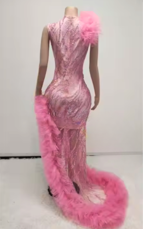 Make your entrance unforgettable in this Pink Beaded Tulle Evening Gown, designed with shimmering rhinestone accents and a dramatic layered ruffle skirt. The high split detail adds a bold, modern edge, while the soft mesh tulle layers create a flowing, princess-inspired silhouette. Perfect for prom, galas, and red-carpet occasions, this gown blends elegance, sparkle, and sophistication.