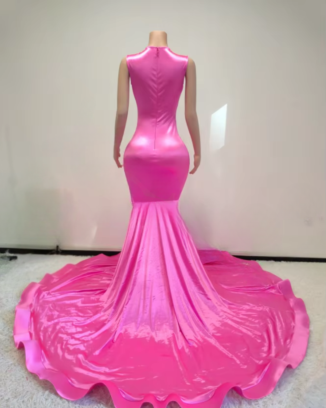 Luxury evening gown with rose rhinestone appliqué and beaded embellishments, styled for formal events and high-glamour occasions.