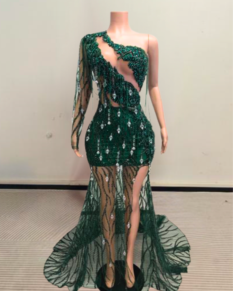 Meet Serenity — elegance with attitude. This One-Sleeve Sequin Prom Dress features a high slit and sparkling sequins that shimmer with every move. The asymmetrical sleeve adds a bold twist, while the fitted silhouette brings that perfect balance of class and confidence. For the girl who glows effortlessly and never blends in.