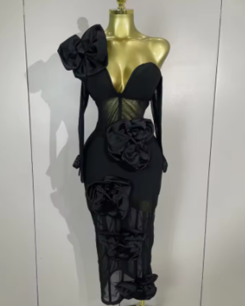 Make a bold statement in the Nia Sexy One Shoulder Bow Mesh See Through Dress With Gloves. Designed for modern elegance, this look blends sheer mesh with a dramatic bow accent for an unforgettable silhouette. Perfect for prom nights, red-carpet events, or evening parties, Nia’s style is all about confidence, beauty, and luxury.
