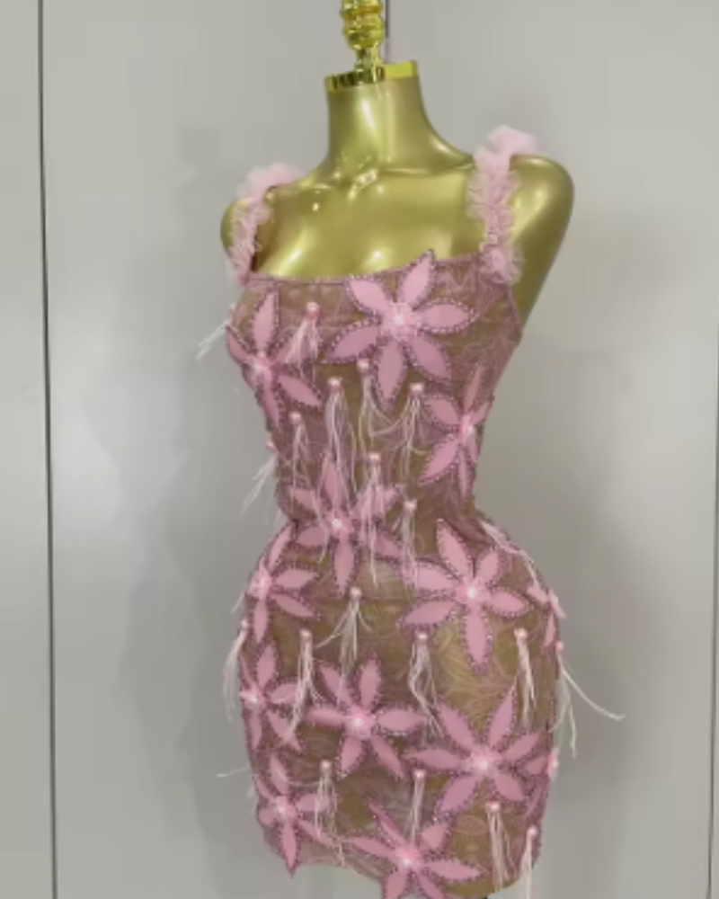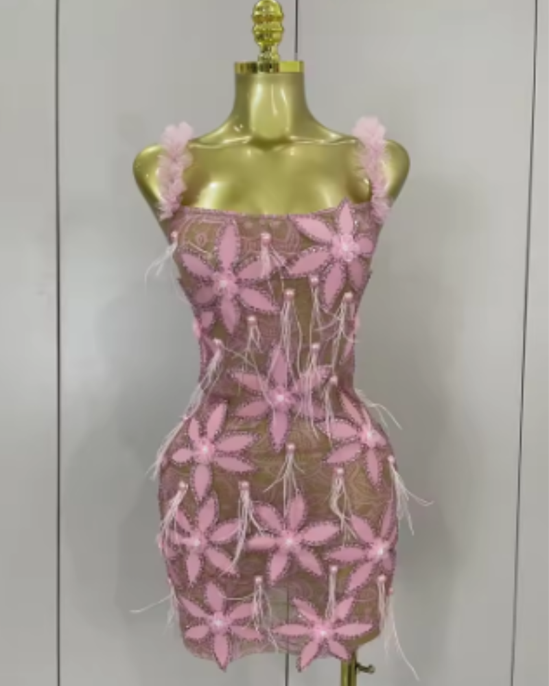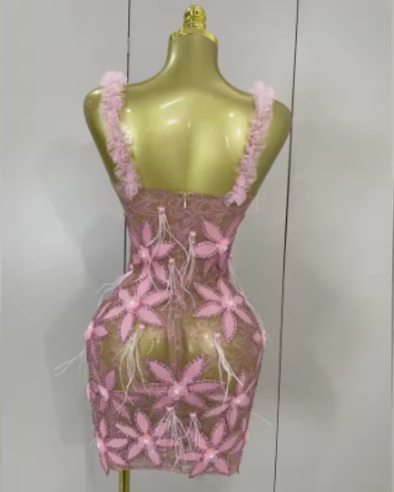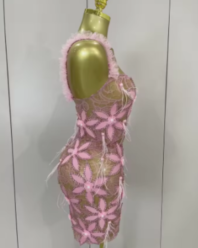 Tati Sparkly Diamond Flowers Feathers Short Dress