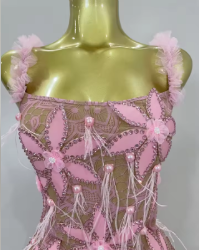 The Tati Sparkly Diamond Flowers Feathers Short Dress is all about statement-making glam. Designed with dazzling diamond accents, delicate floral details, and soft feather trim, this short dress captures attention from every angle. Perfect for prom, birthdays, or high-fashion events, Tati’s look radiates confidence and red-carpet sparkle.
