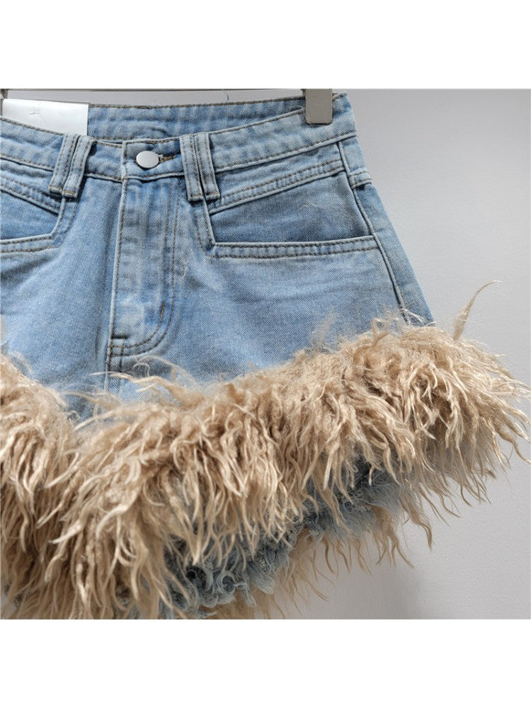 Fluff Denim A-line Fur Trim Shorts