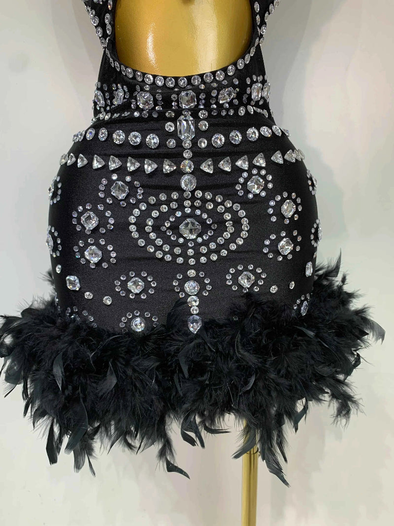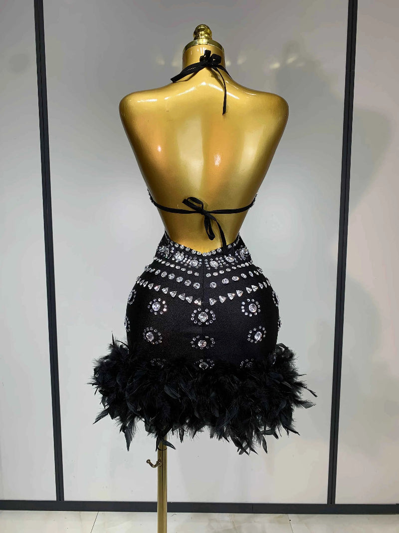 Women Sexy Halter Crystal Feathers Bodycon Mini Dress Nightclub Performance Stage Outfit Luxury Birthday Photo Shoot Dress