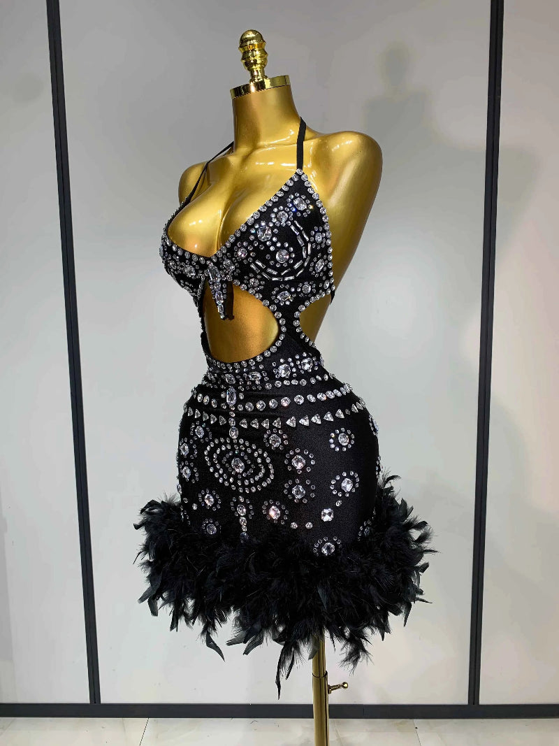 Jamie Sexy Halter Crystal Feather Bodycon Mini Dress