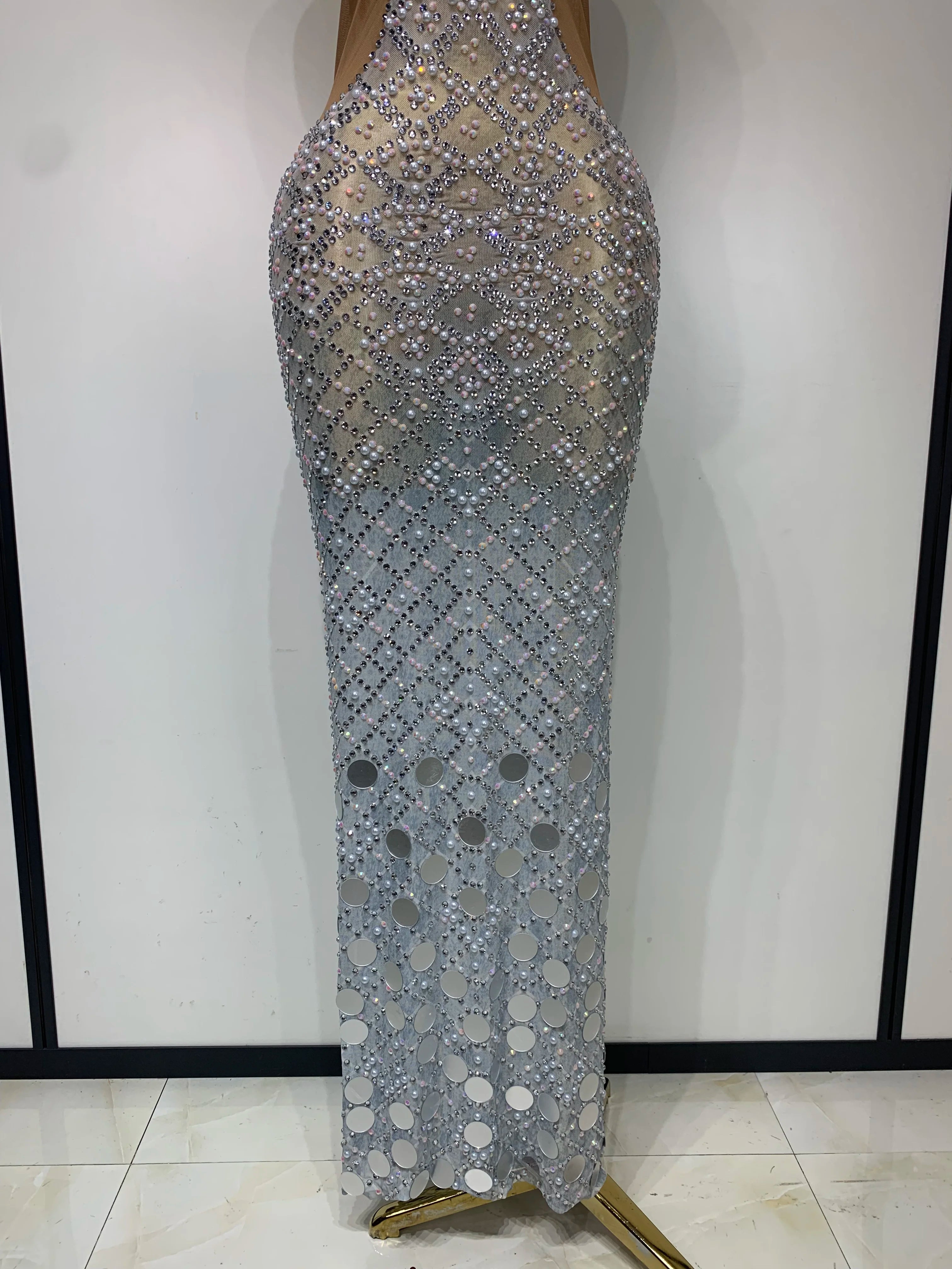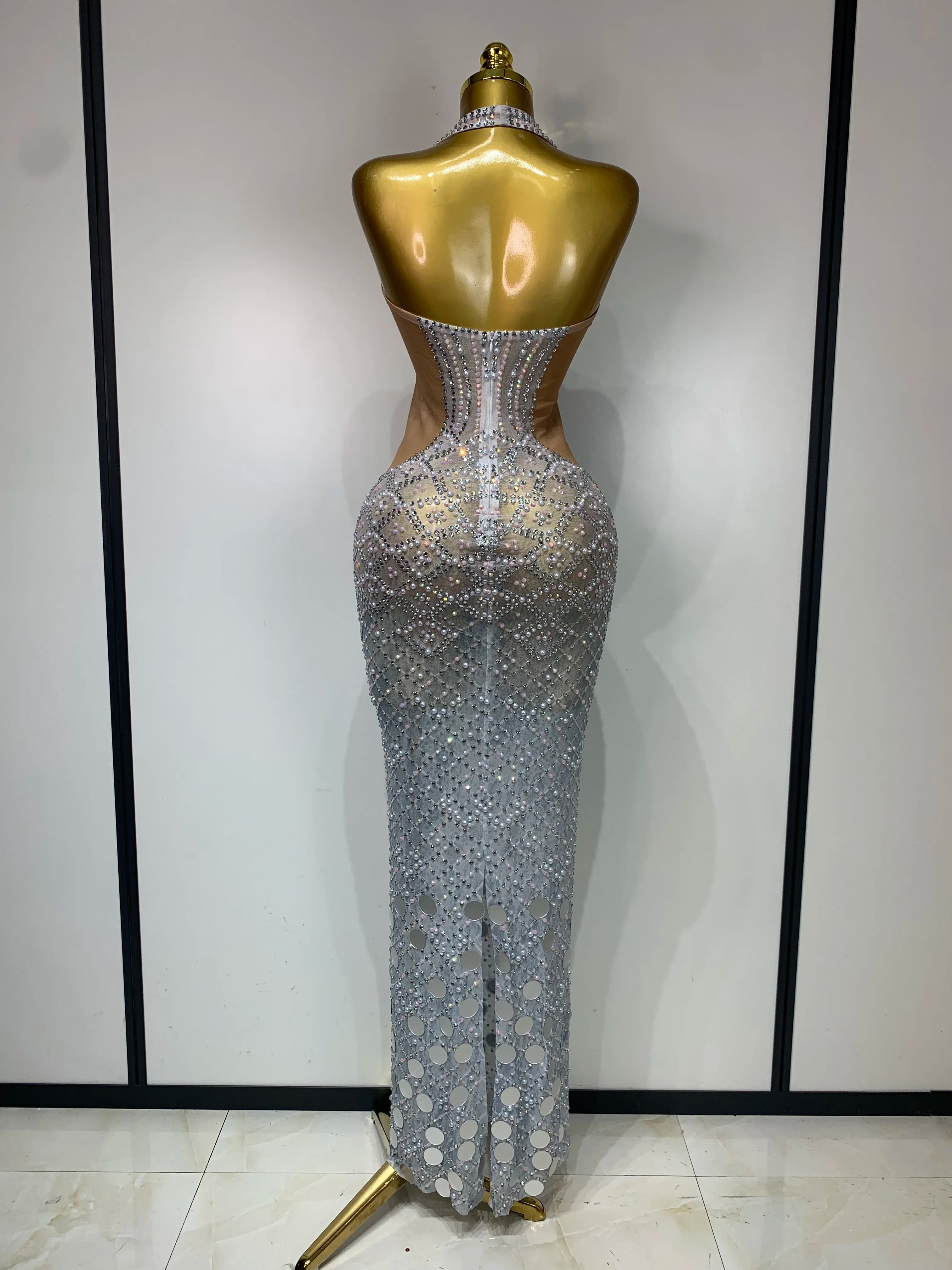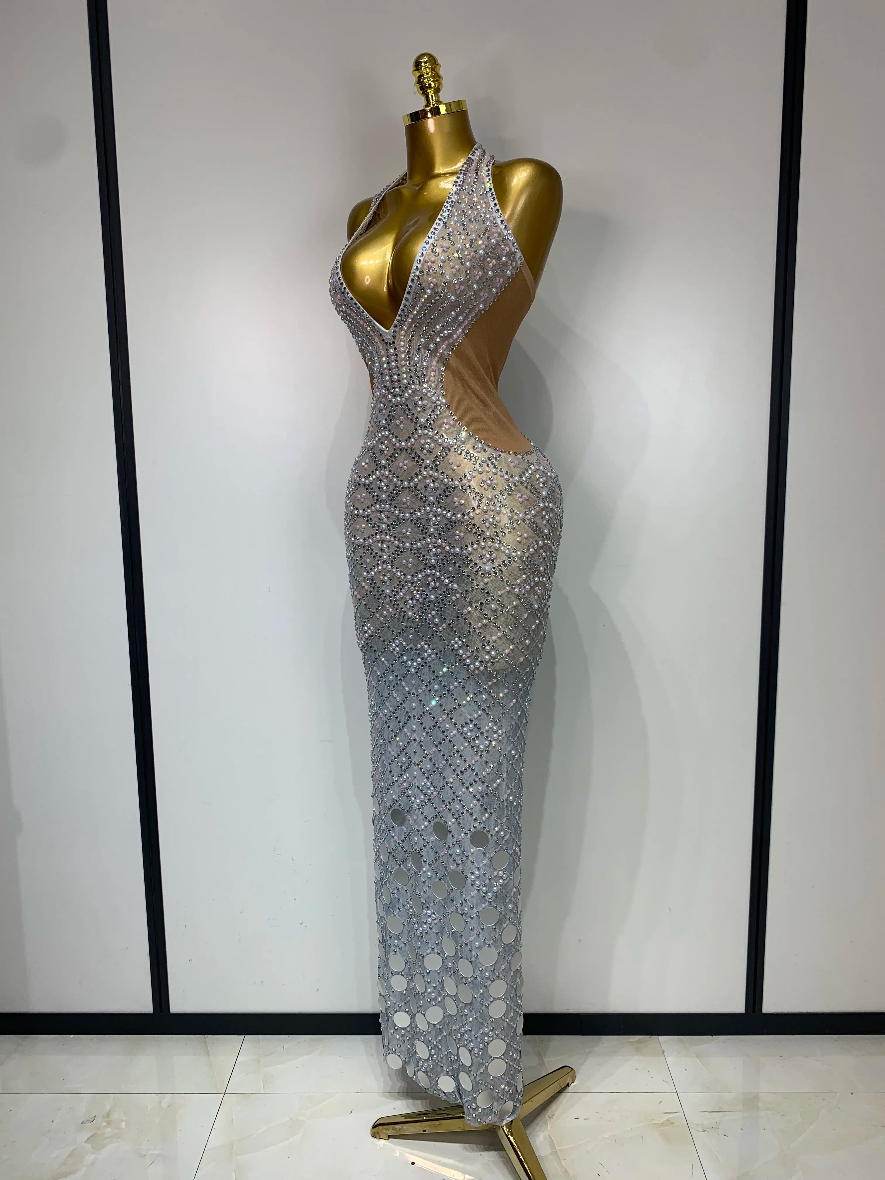 Charm Sparkly Rhinestone Sexy Halter Mesh V-Neck Backless Dress