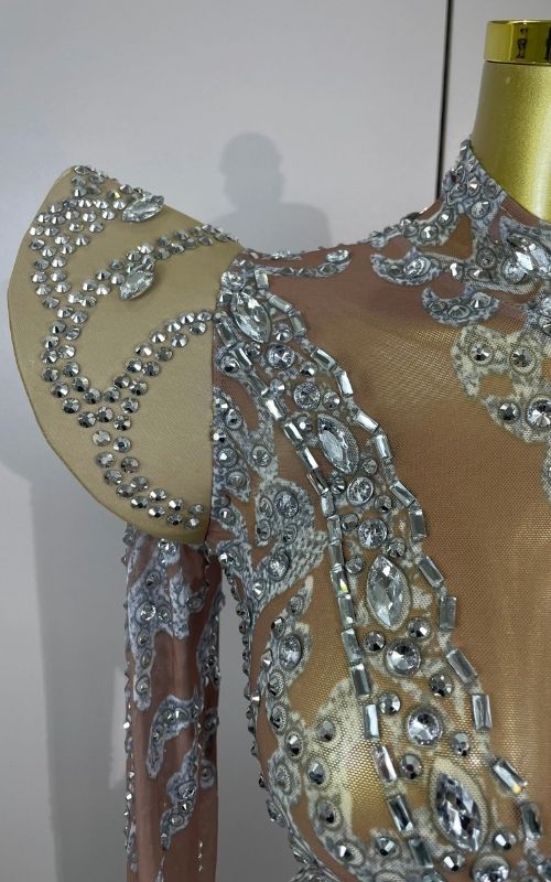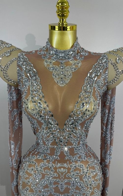 The Annie Short Dress is all about sparkle and confidence. Designed with a transparent illusion base, this mini silhouette is fully detailed with shiny rhinestones that reflect light from every angle.
