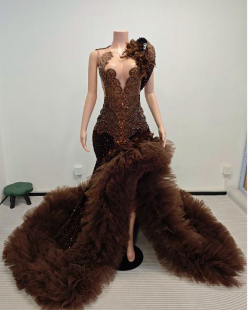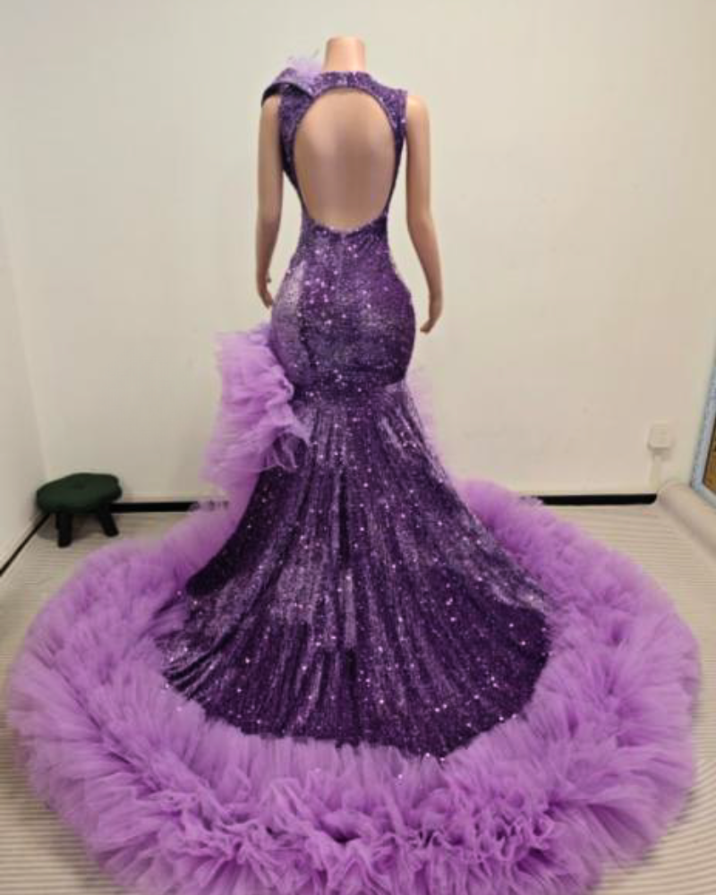 The Azalea comes in loud, proud, molten orange. The deep V neck gives that bold confidence, while the full sequin body catches light like it owes you money. The mermaid silhouette hugs every curve then flares into a tulle train that ruffles out behind you like fire in slow motion. It is that showstopper dress made for girls who walk into a room and instantly shift the vibe. Perfect for prom nights, red carpet themes, or any moment where subtle just is not the assignment.