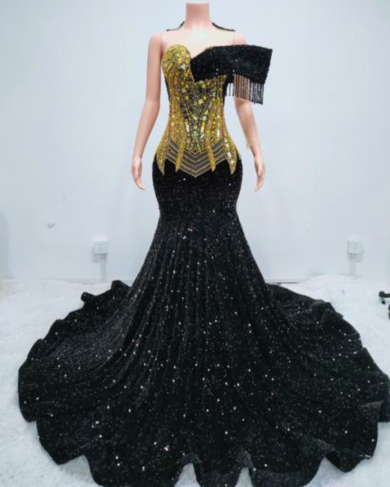 Nala walks in like a rhythm you can’t ignore. The off shoulder neckline frames the collarbone, giving that soft glam vibe while the full sequin body catches every beam of light. The geometric pattern shapes the figure like art you can wear, moving smoothly into a mermaid skirt that flares with attitude. Long fringe details sway with every step, turning the whole dress into a living performance. It is bold, modern, and built for girls who want that main character glow the moment they enter the room.