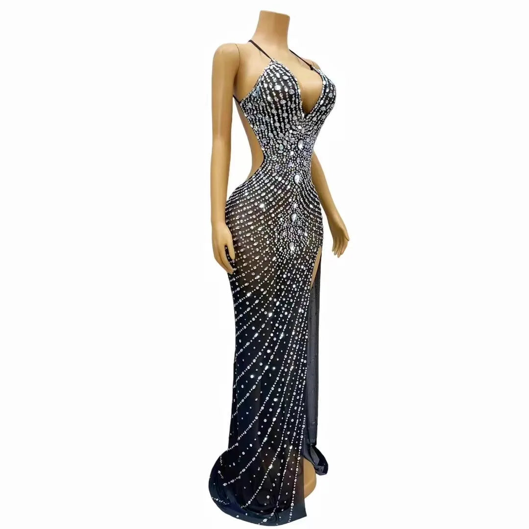 The high split design adds a dramatic, sexy flair, allowing you to showcase your legs and move with confidence on the dance floor. Its sophisticated cut and comfortable lining make it a perfect fit for a long night of celebration. Whether attending a prom, a gala, or a black-tie wedding, this rhinestone dress is the definition of glamour. Choose this sparkling formal dress to make a bold, unforgettable fashion statement.