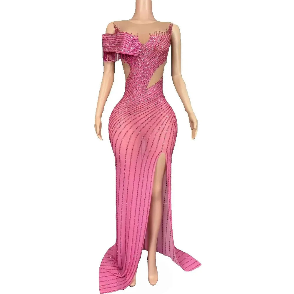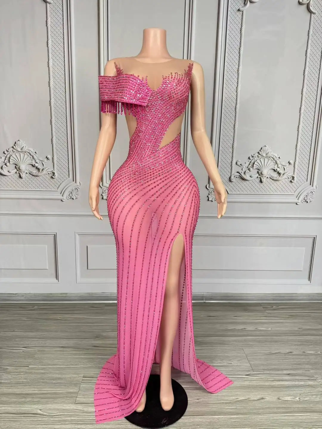 A tasteful high split runs up the side, providing a subtle sexy element and ensuring ease of movement, allowing you to dance the night away in comfort and style. The classic, flattering silhouette ensures a graceful drape and a stunning fit. Choose this rhinestone split dress for an elegant look that is both sophisticated and strikingly modern, making a truly unforgettable entrance.