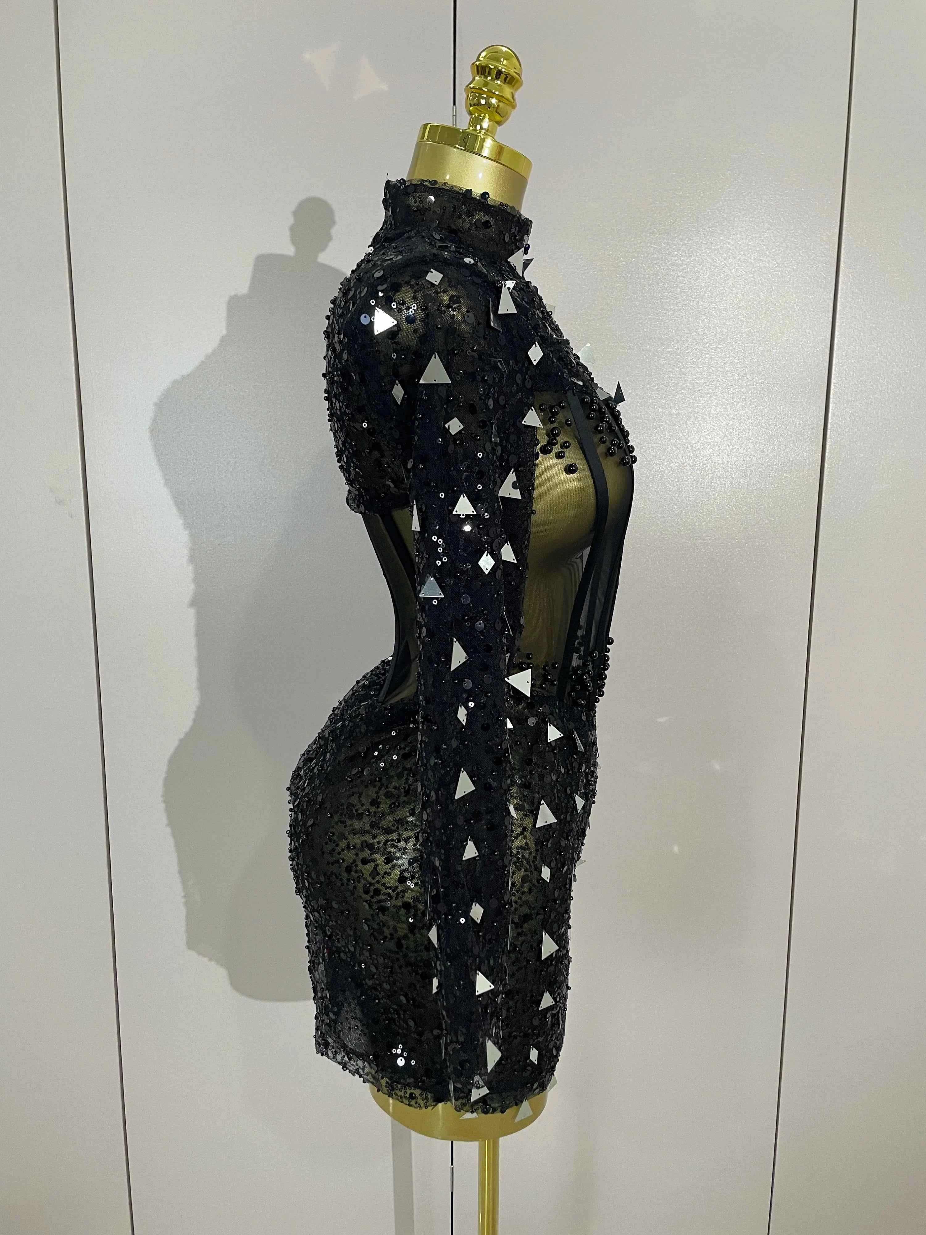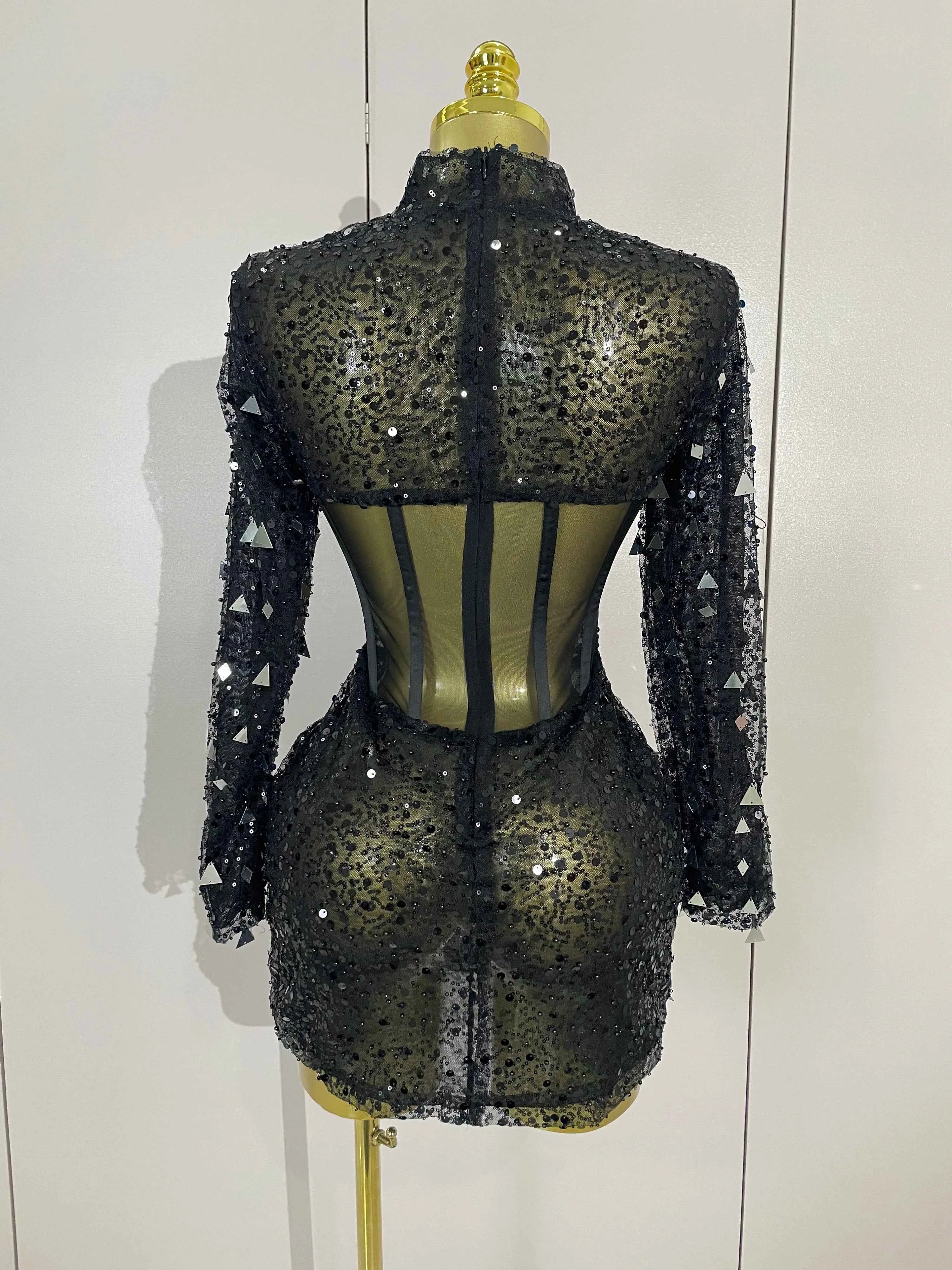 Emily Shiny Sequin Pearl Black Mesh Long Sleeve Bodycon Mini Dress