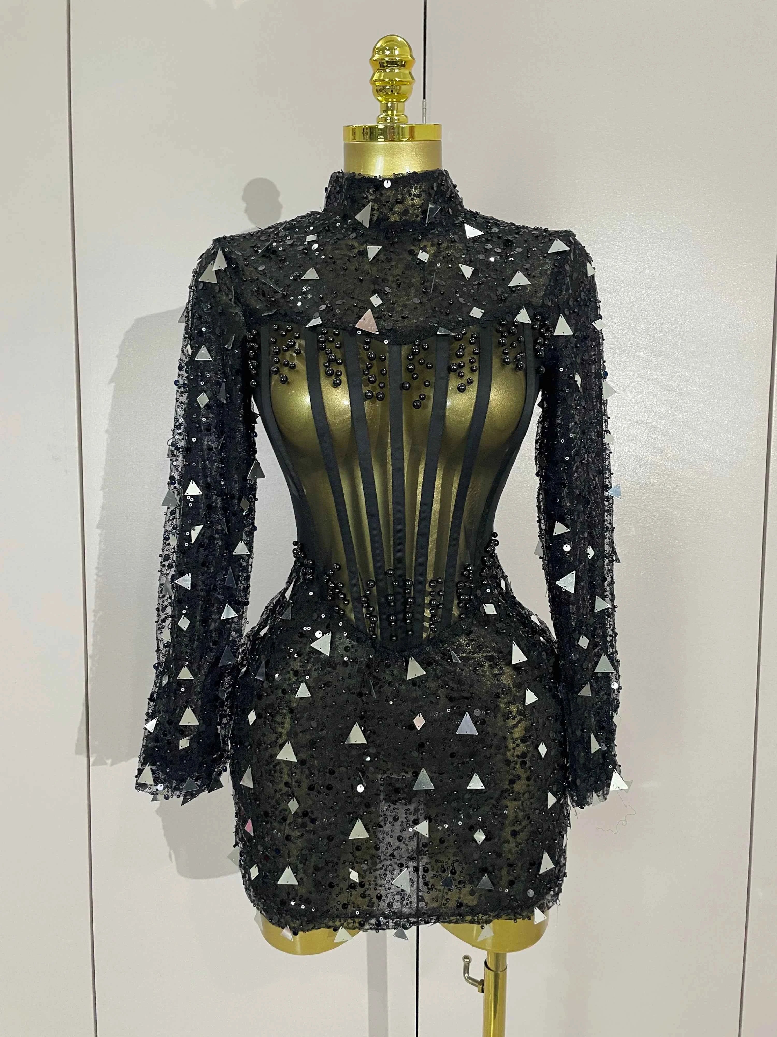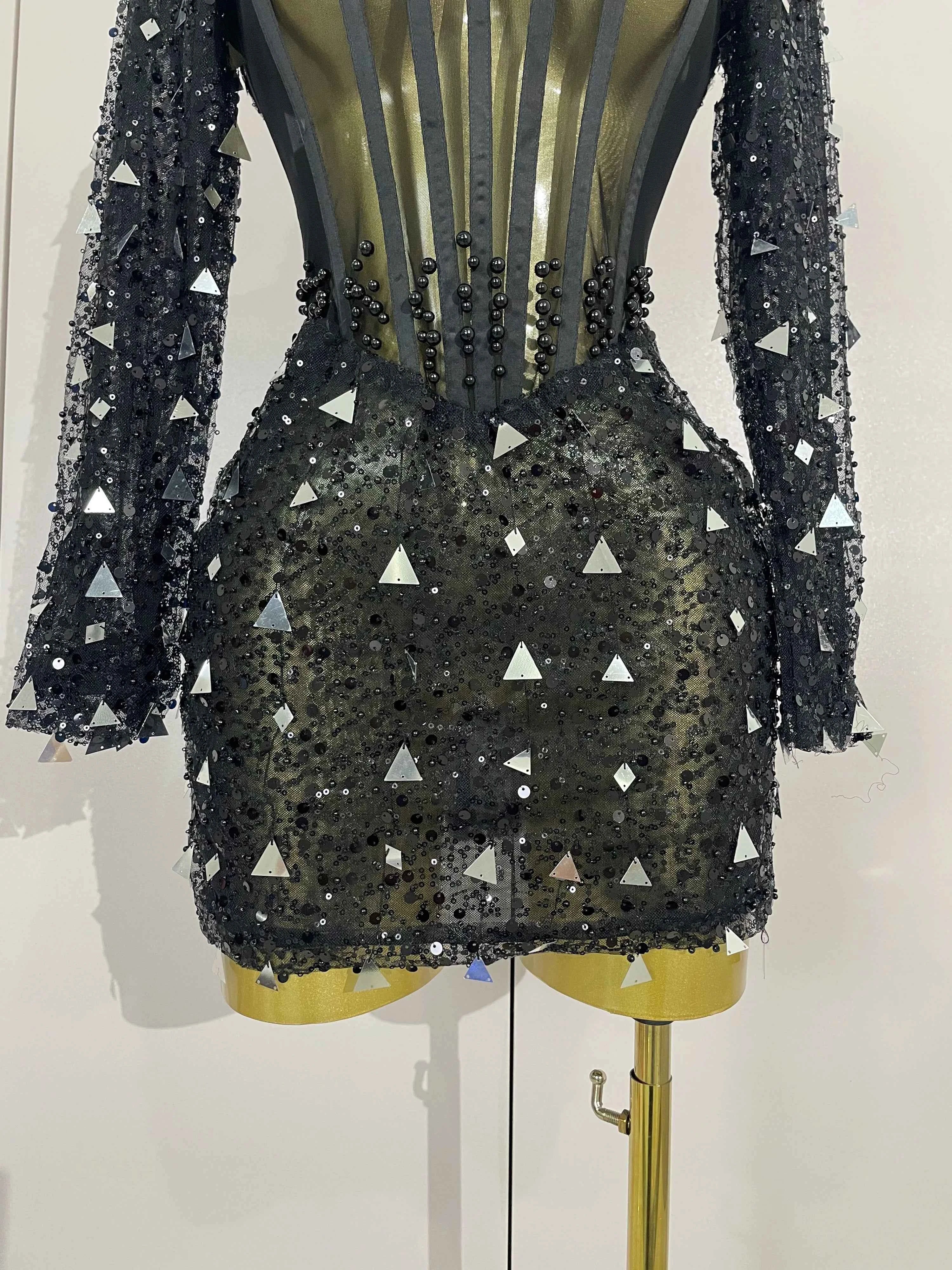 Shiny Sequin Pearl Sexy Black Mesh Long Sleeve Bodycon Mini Dress Women Celebrate Evening Birthday Party Nightclub Stage Costume