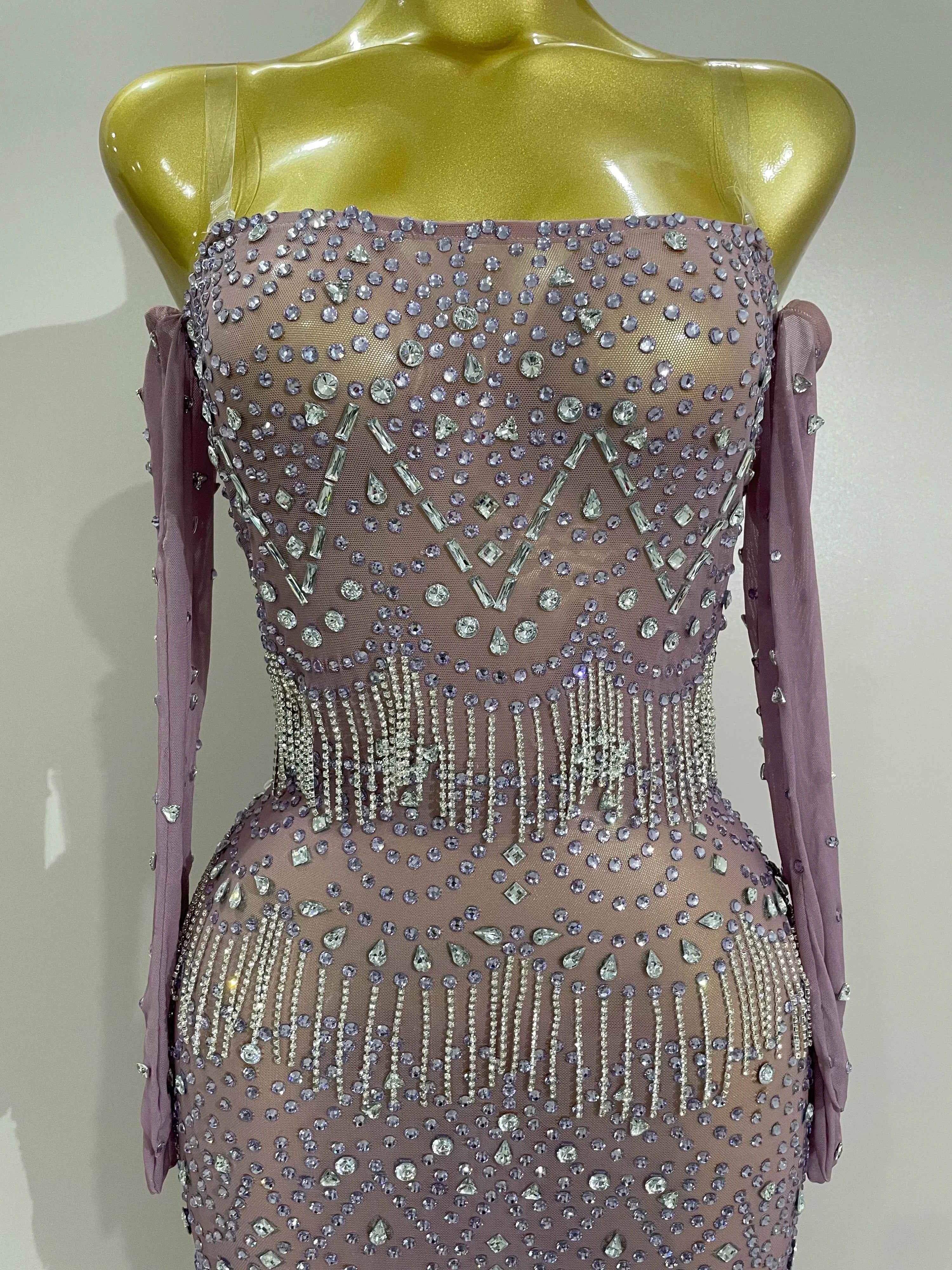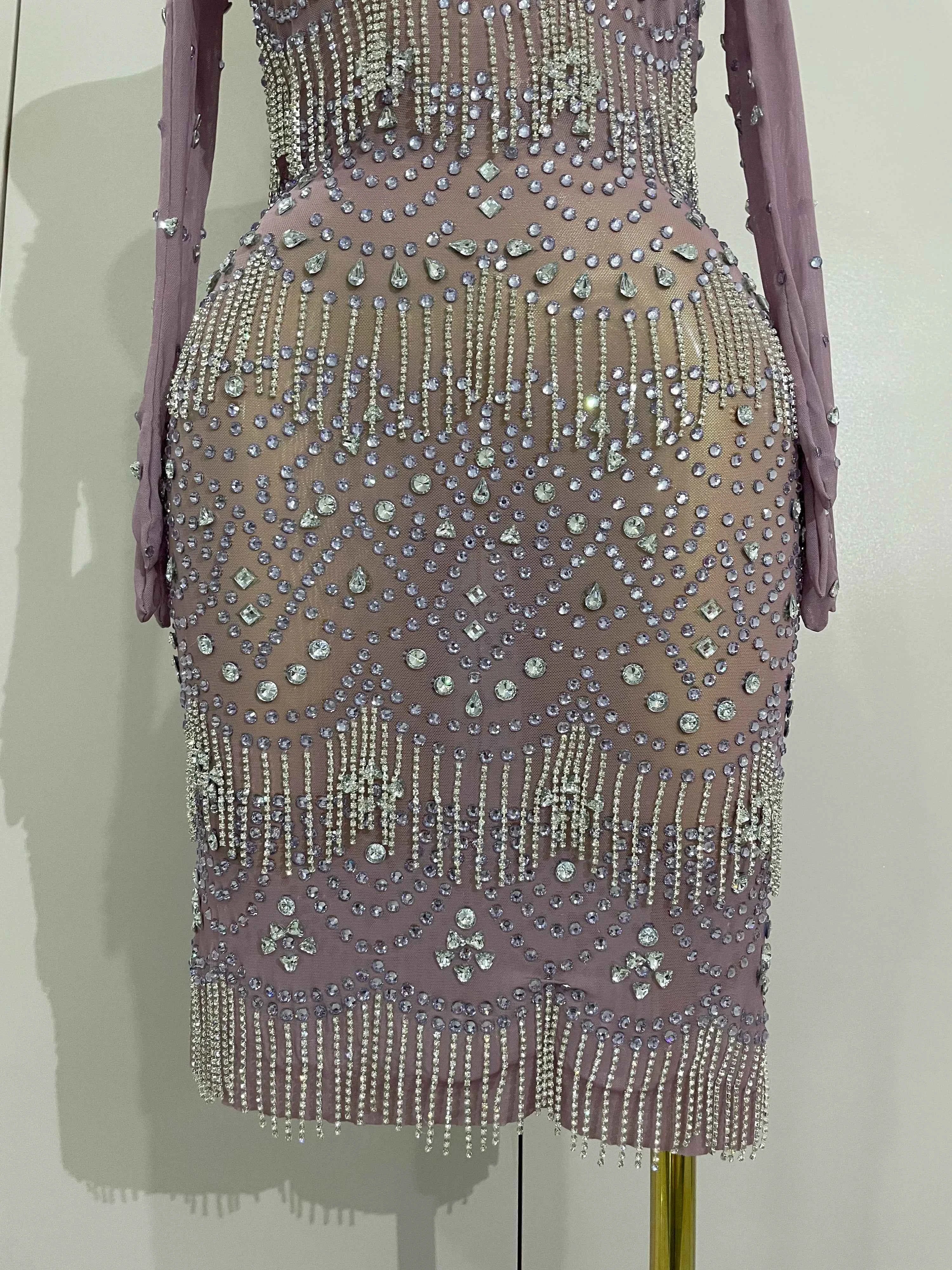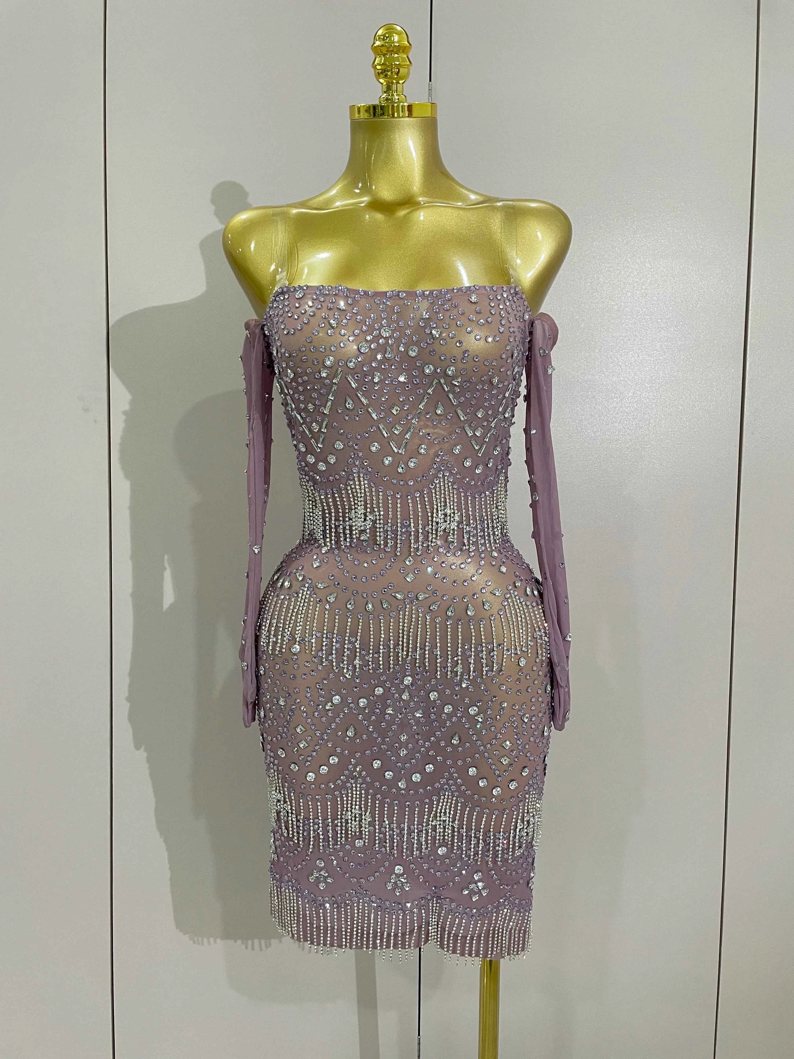 Luxury Sparkly Rhinestones Chain Sexy Mesh Purple Mini Dress With Gloves Women Evening Birhthday Party Nightclub Stage Costume