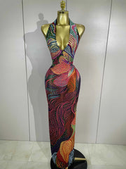 Sexy Colorful Rhinestone Print Long Dress Woman Halter Deep V Neck Backless 2026 Women Birthday Eveing Party Club Stage Costume