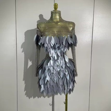 Cleo Luxury Sparkly Diamond 3D Acrylic Leaf Mesh Transparent Mini Dress