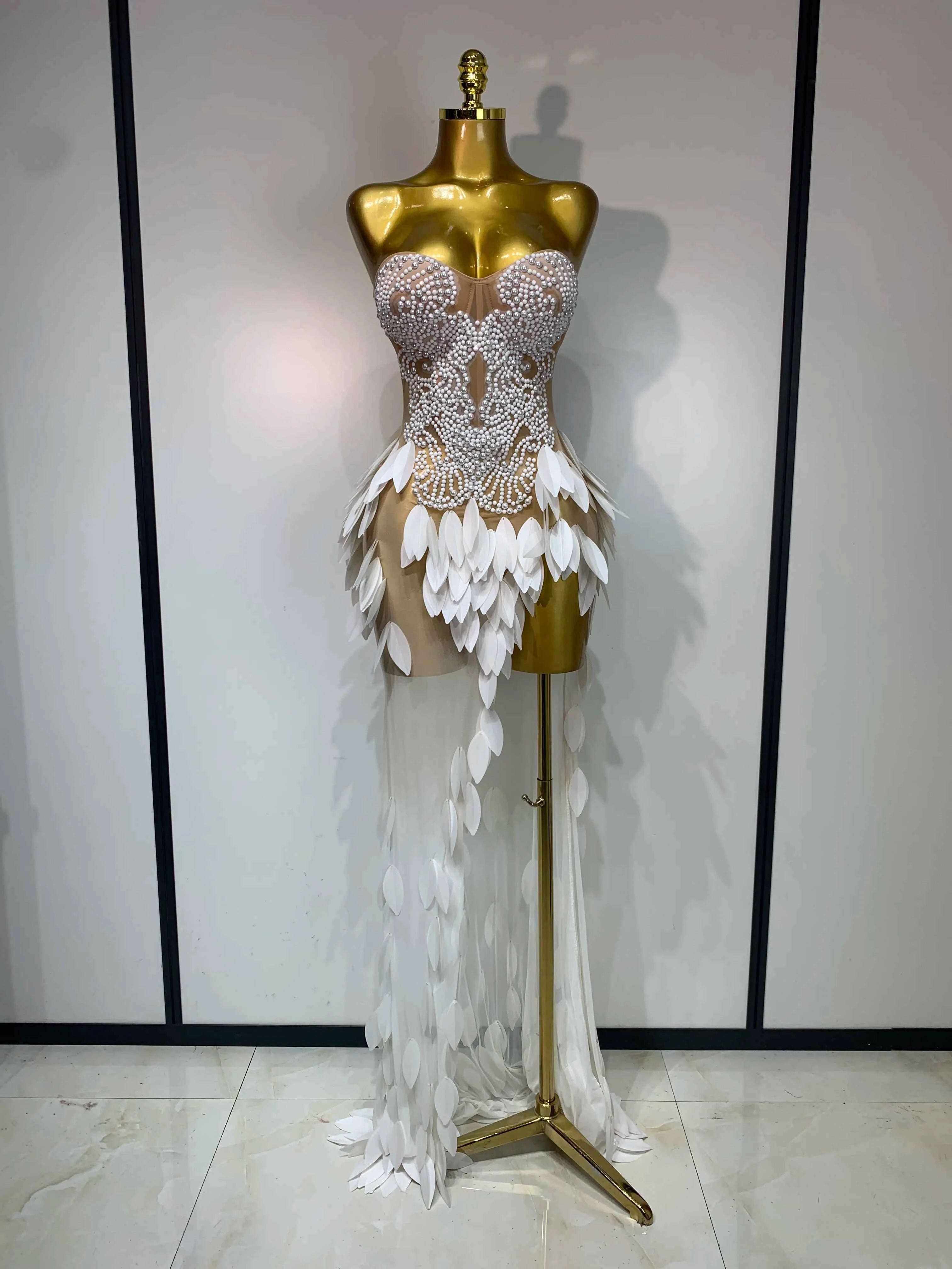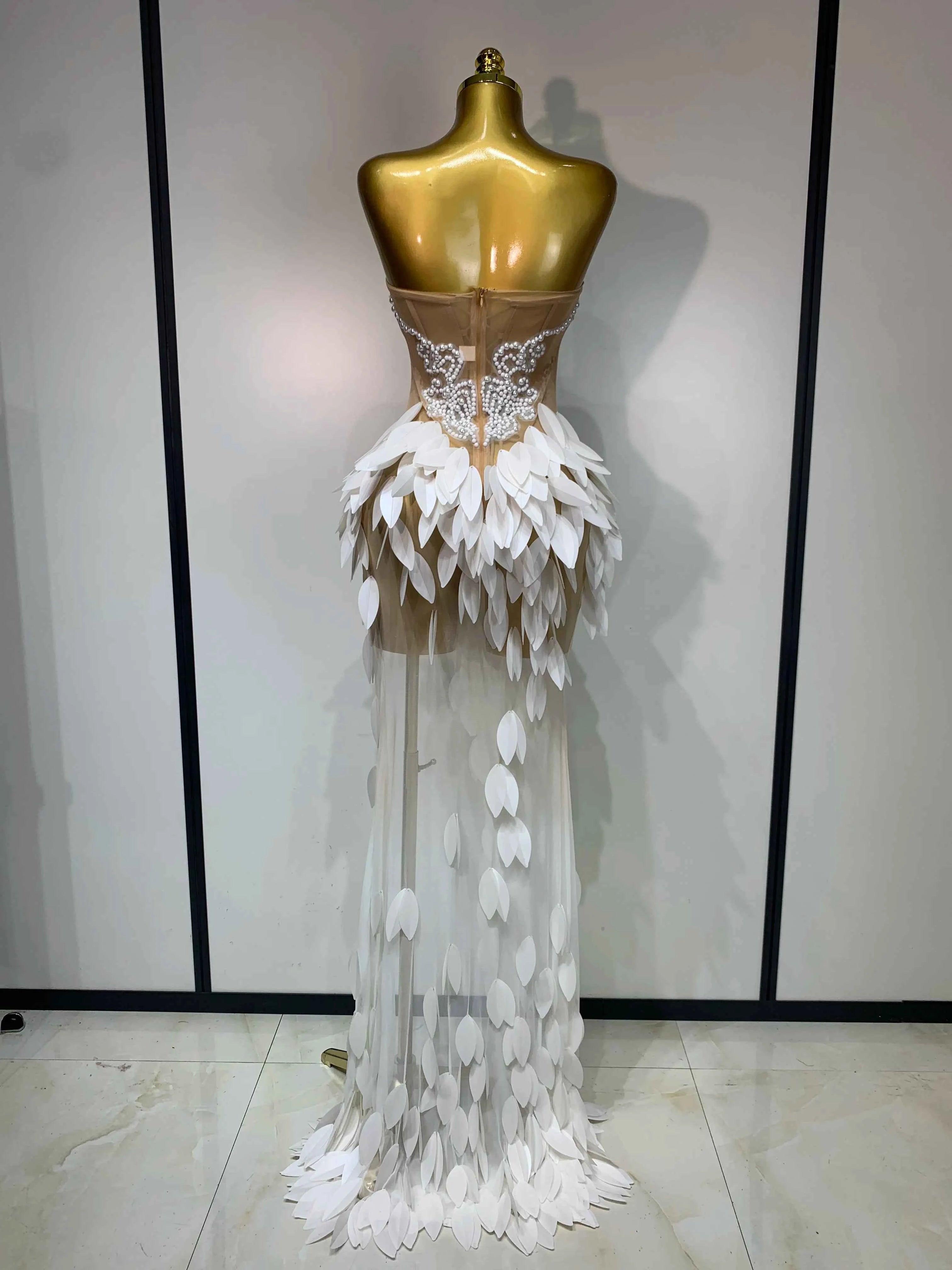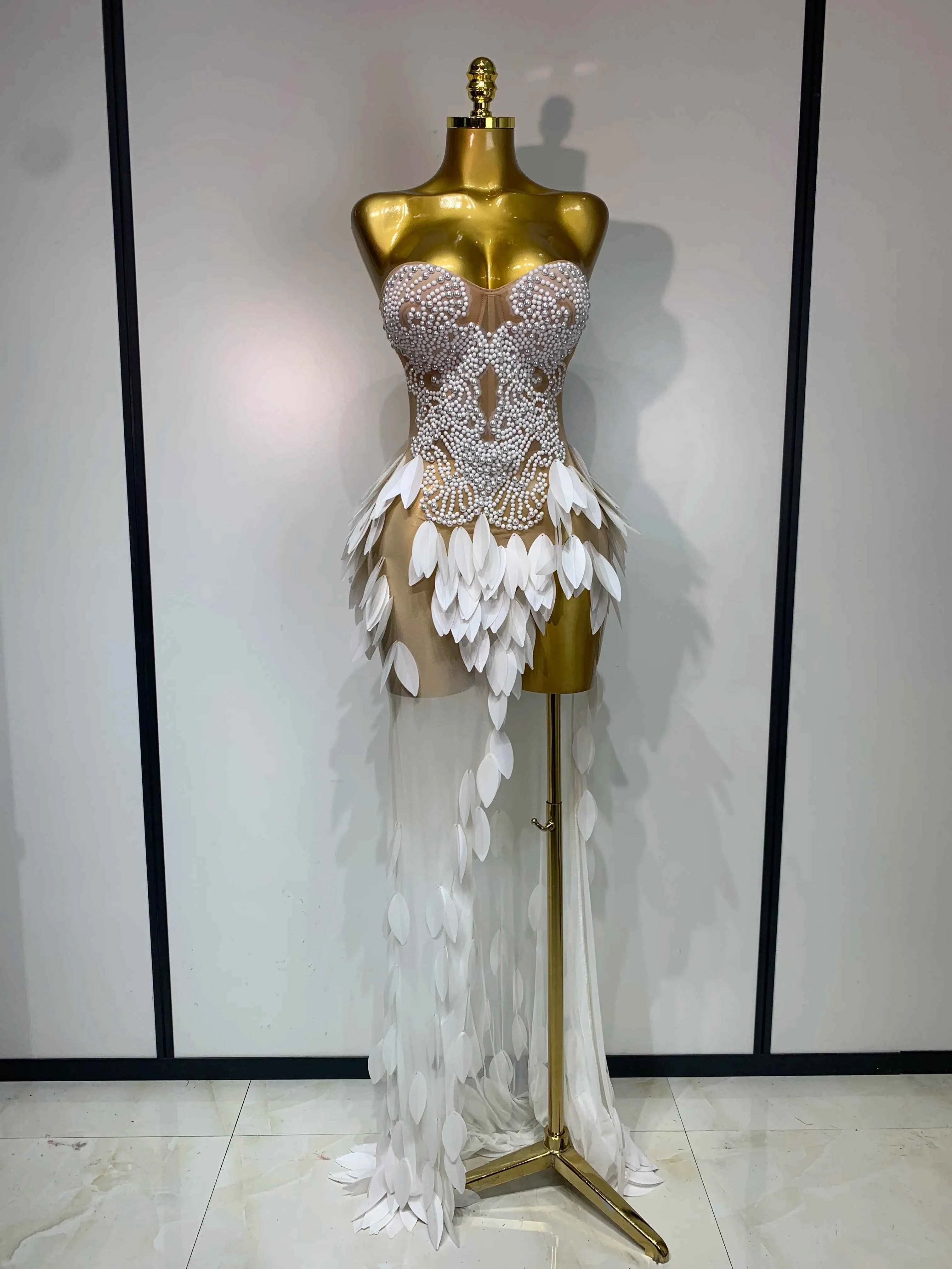 Elegant Pearl Dress Sexy Transparent Mesh Maxi Long Dresses Women Evening Party Wedding Gown Red Carpet Celebrity Stage Outfit