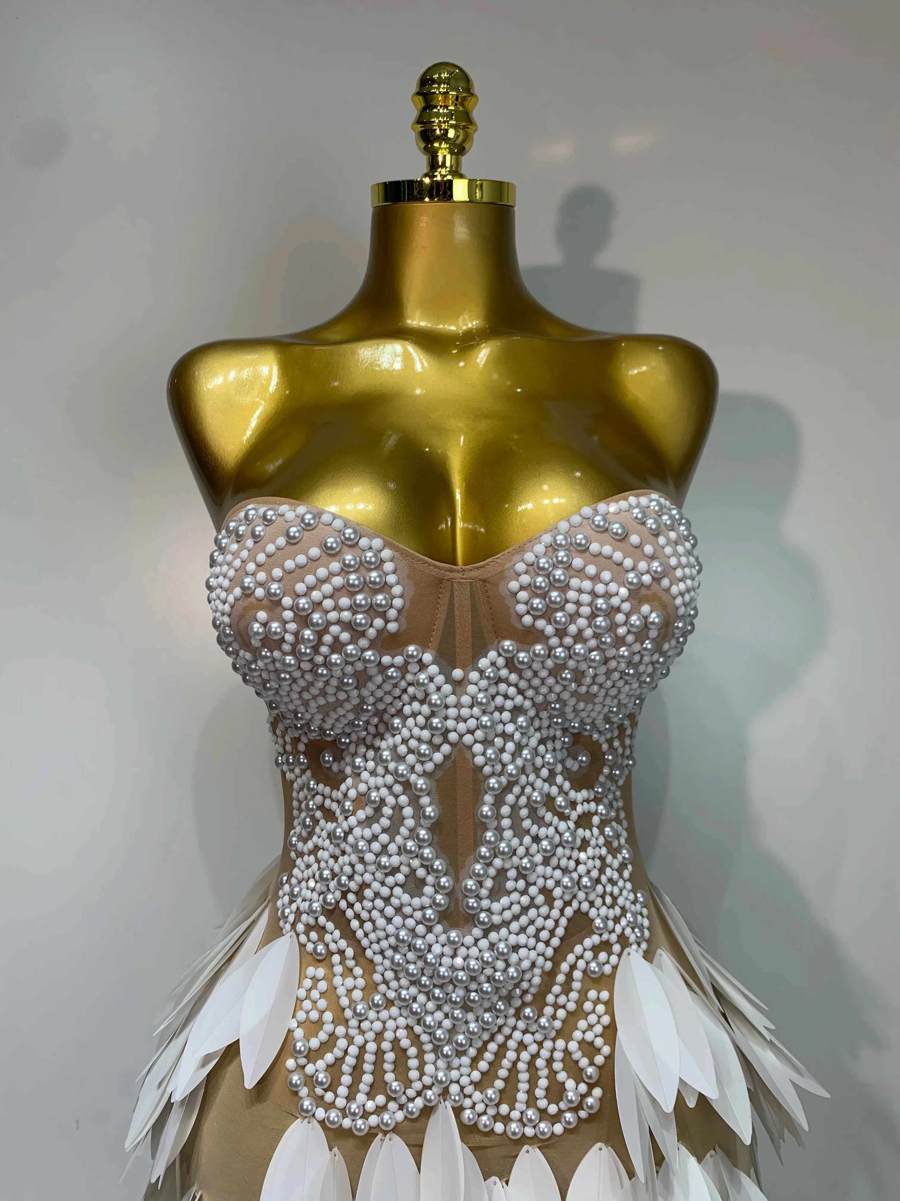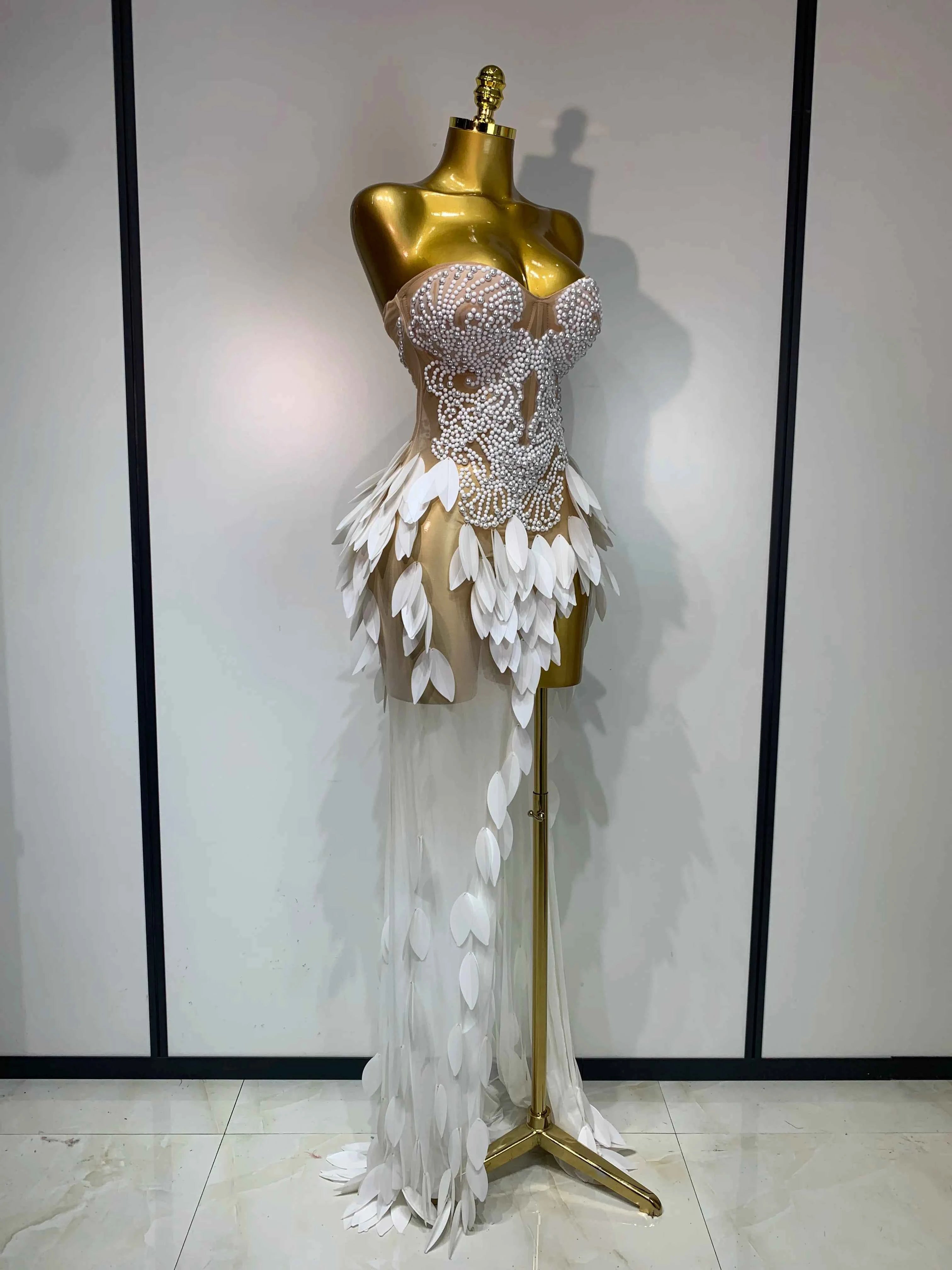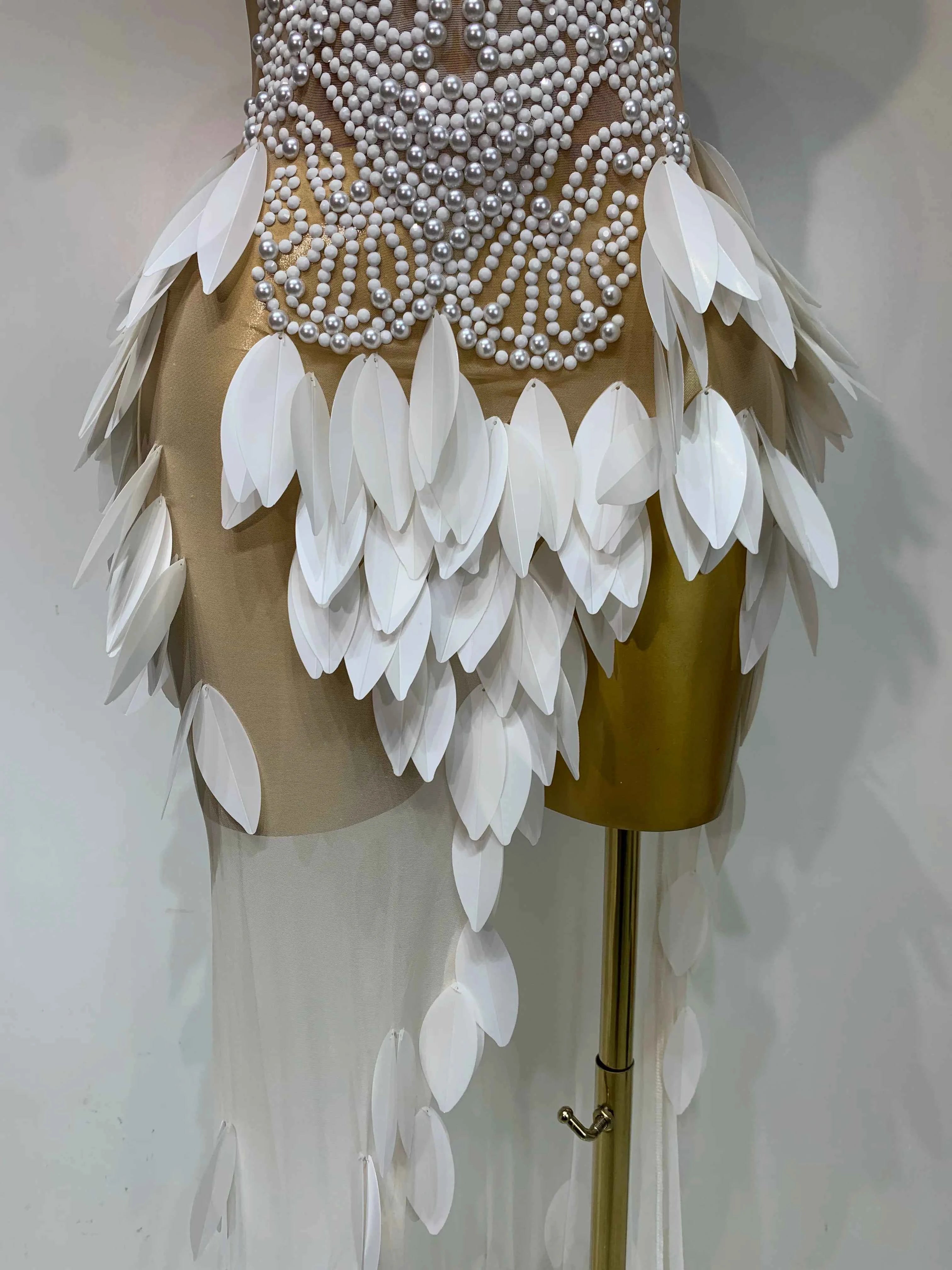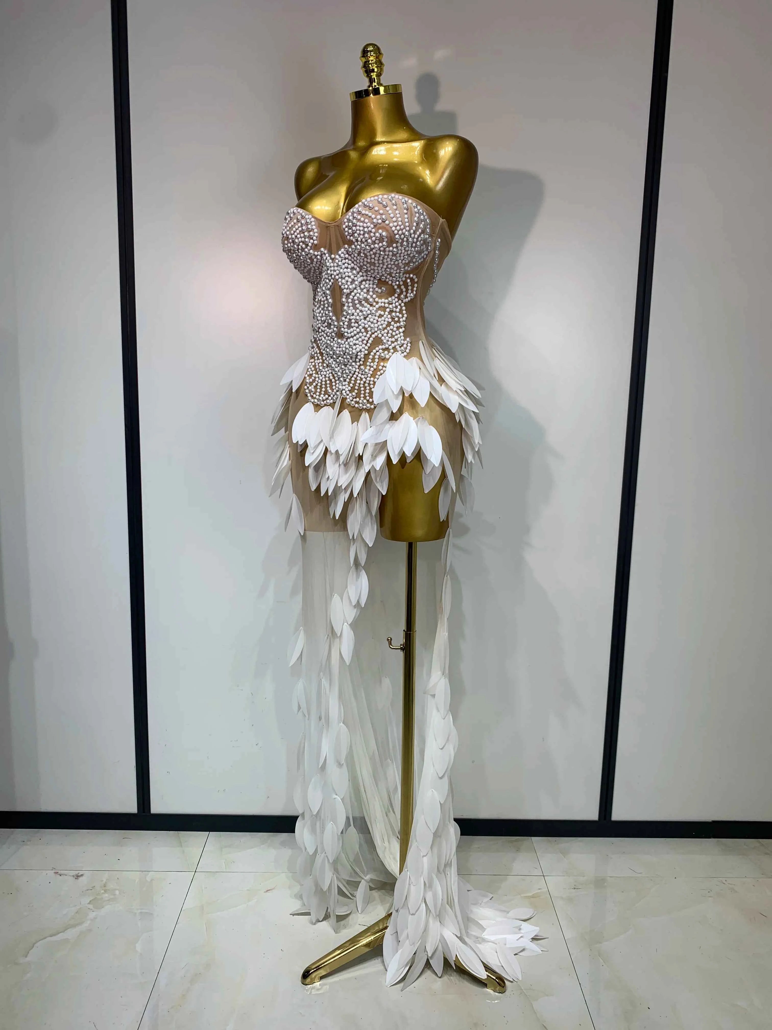 Elegant Pearl Dress Sexy Transparent Mesh Maxi Long Dresses Women Evening Party Wedding Gown Red Carpet Celebrity Stage Outfit