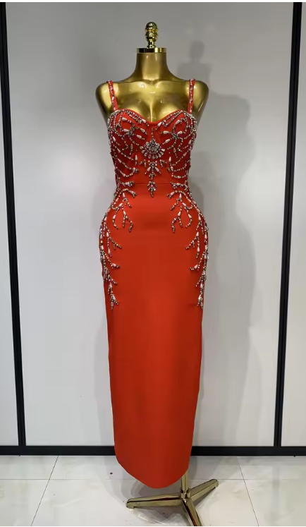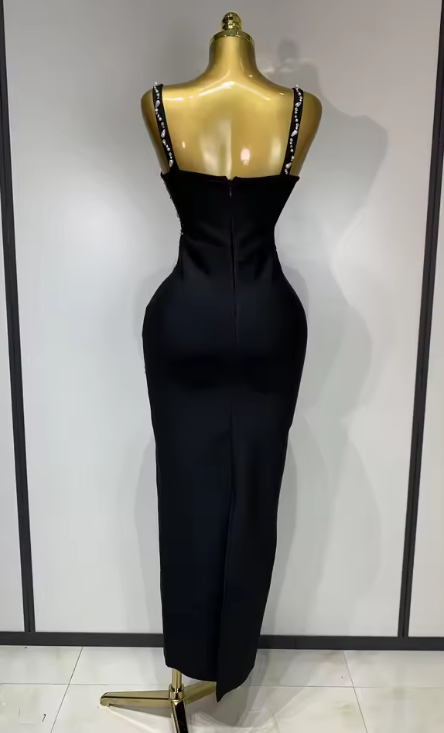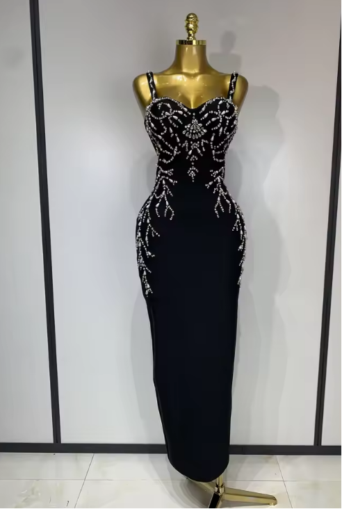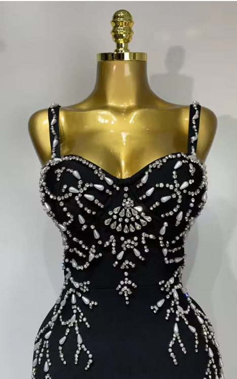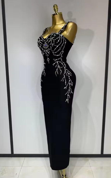 Designed for high-profile galas, black-tie weddings, or milestone celebrations, the Sasha garment combines the structural support of a bandage dress with the flowing grace of a maxi gown. The monochromatic black-on-black beadwork offers a refined, high-fashion aesthetic that captures the light with every move.