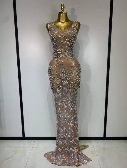 Command unparalleled attention in the Eniola Luxury Diamonds Mesh See Through Long Dress. This breathtaking gown is a masterpiece of light and shadow, featuring a delicate, high-stretch sheer mesh foundation that creates a stunning "second-skin" effect. The Eniola garment is meticulously hand-embellished with hundreds of premium light-refracting diamonds, placed to contour and highlight the natural curves of the body.