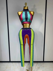 Pamela Sparkly Rhinestones Colorful Top and Pants Two-Piece Set