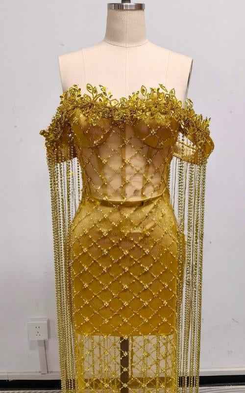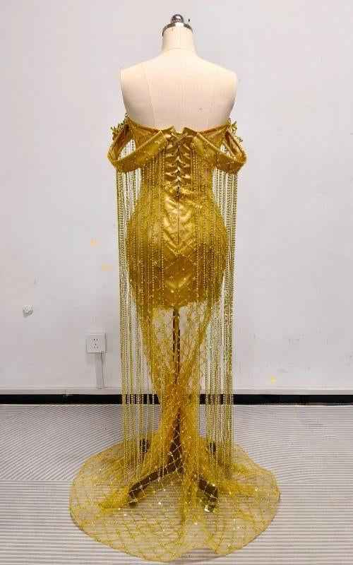 Gilded Goddess Off-The-Shoulder Gold Corset Gown With Beaded Fringe And Lattice Mesh Skirt