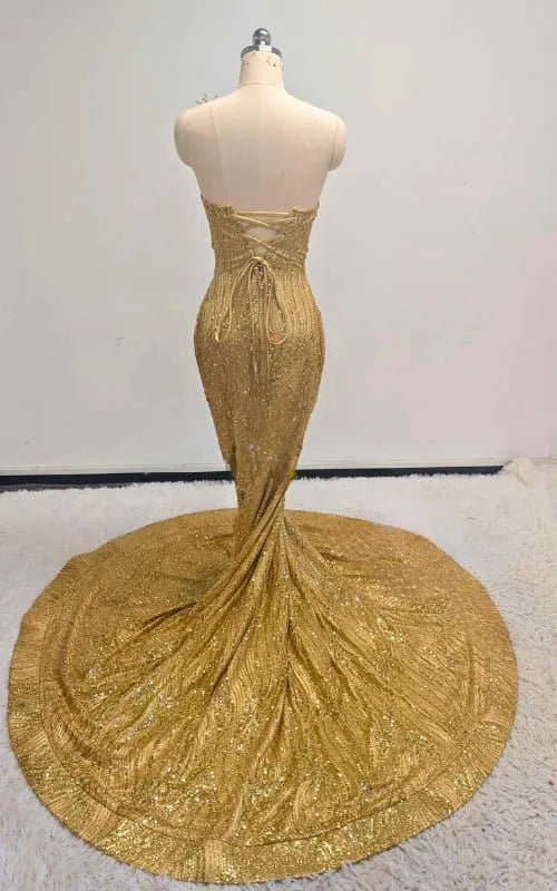 Shine like royalty in this radiant gold mermaid gown. Covered in shimmering sequins and adorned with 3D gilded leaf appliqués, the dress features an illusion plunging neckline and a dramatic circular cathedral train. The figure-hugging mermaid silhouette sculpts your curves while the intricate detailing and flowing train add movement and grandeur. Perfect for red carpet events, galas, weddings, and any evening where you want to captivate every gaze.