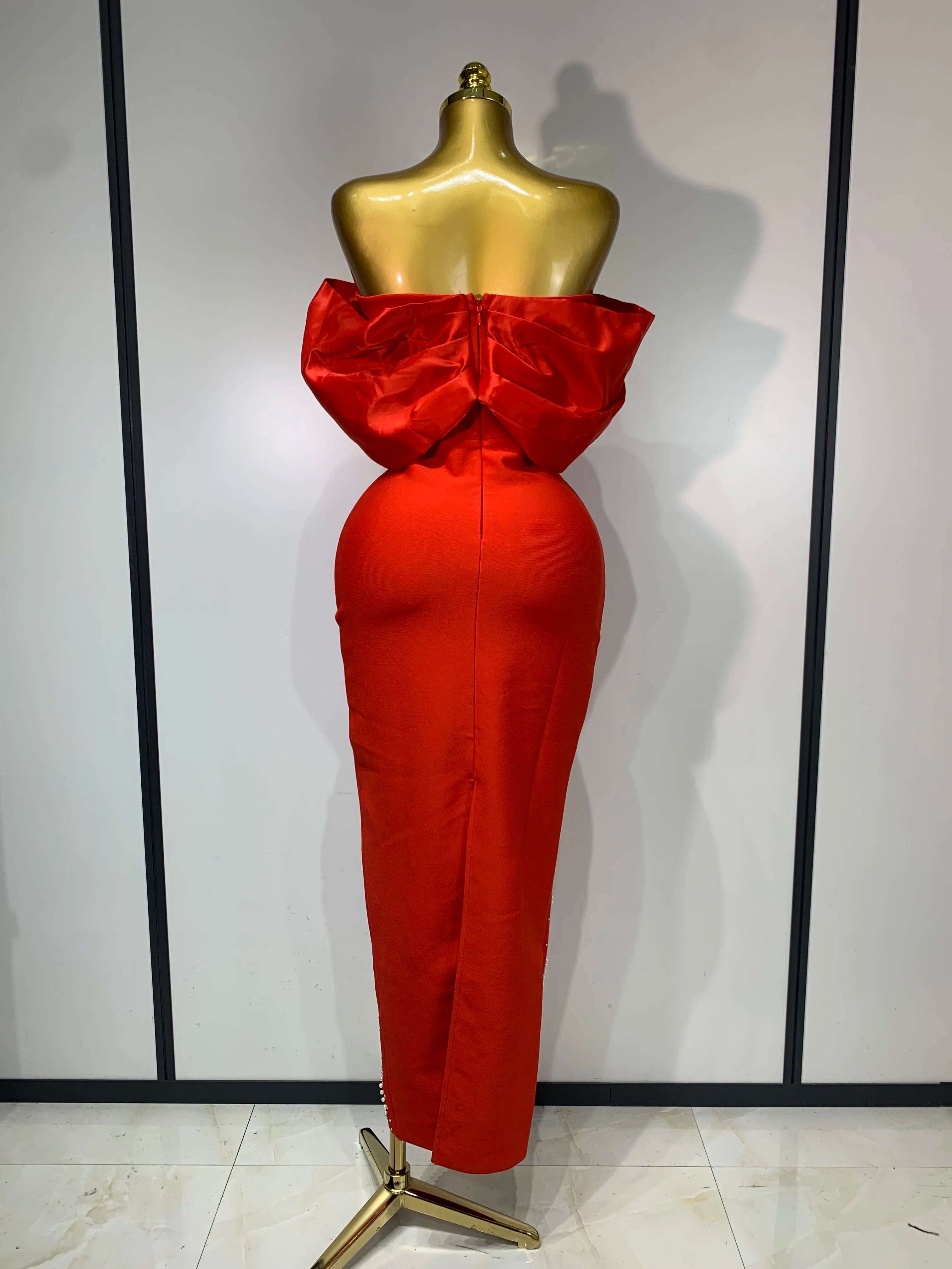 The Cali dress delivers a striking mix of elegance and bold color. This red maxi bandage gown features an off shoulder neckline that highlights the collarbone and creates a smooth, feminine silhouette. Intricate beading adds a refined shine, giving the dress a luxurious finish that photographs beautifully. The bodycon fit sculpts the figure while the stretchy bandage fabric keeps the look comfortable and supportive for long events. Perfect for evening parties, formal celebrations, birthdays or any moment that calls for a confident, high quality statement dress.