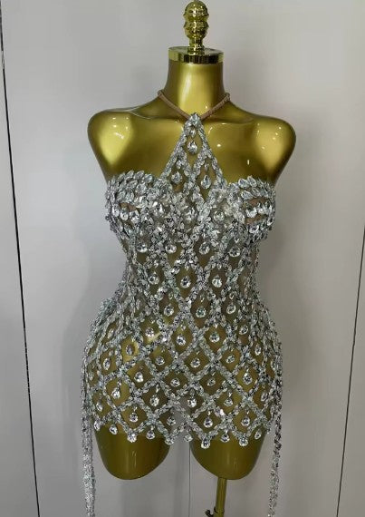Kyra sparkly sequin diamond mesh two-piece dress set with transparent top for women’s evening, birthday, or party wear.