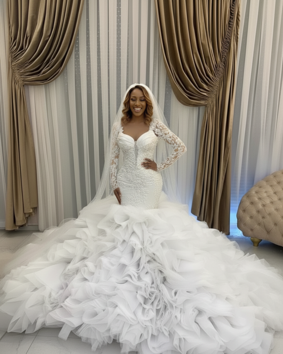 Elegant vintage mermaid wedding gown with full sleeves, pearl appliqués, and layered ruffled skirt.