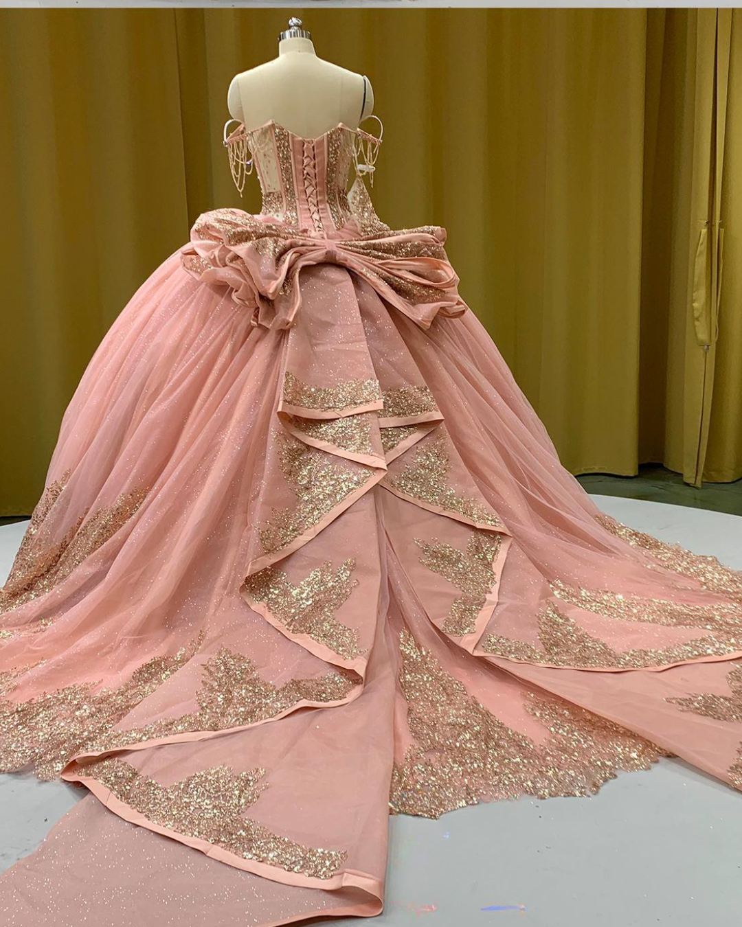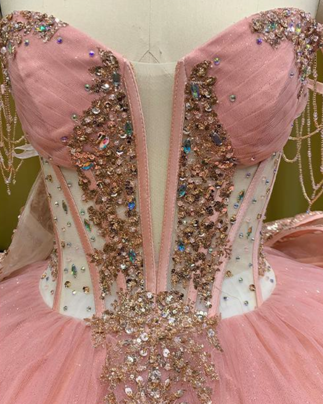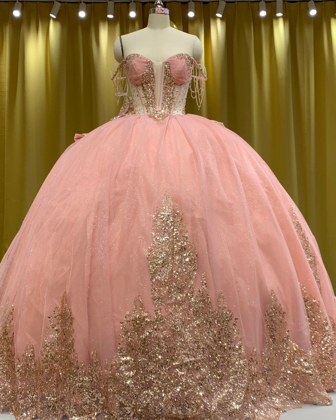This quinceañera ball gown features a strapless peach and coral palette layered in soft glitter tulle for a glowing, romantic look. Ombre gold sequin appliqués add depth and sparkle, blending smoothly from bodice to skirt. The full silhouette gives classic princess volume while the warm tones create a modern, radiant finish perfect for milestone celebrations.
