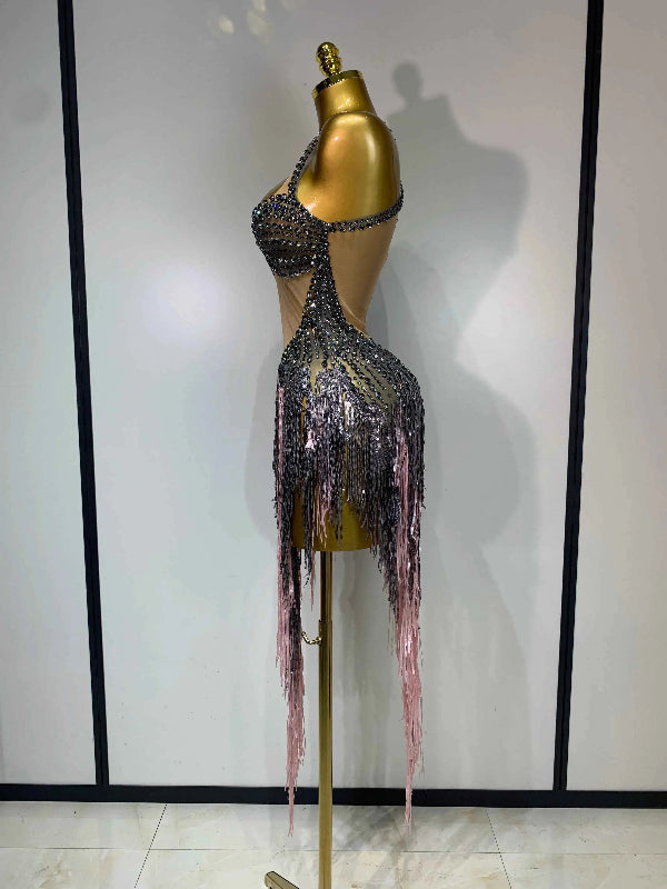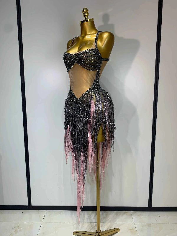 The Vanessa dress is made to shine under every spotlight. Crafted with sheer mesh and covered in sparkling rhinestones, this body-hugging silhouette accentuates curves while tassel details add dynamic movement. Perfectly designed for pole dancers, singers, performers, or anyone owning the stage, this dress is also ideal for evening parties, club events, and special celebration nights. Bold, glamorous, and unapologetically eye-catching.