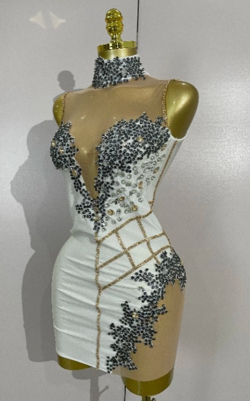 The bodycon fit sculpts the figure, balancing bold transparency with structured shaping for a confident party look. Perfect for birthdays, club nights, performances, and celebration events, this mini dress is made for movement, lights, and unforgettable entrances.