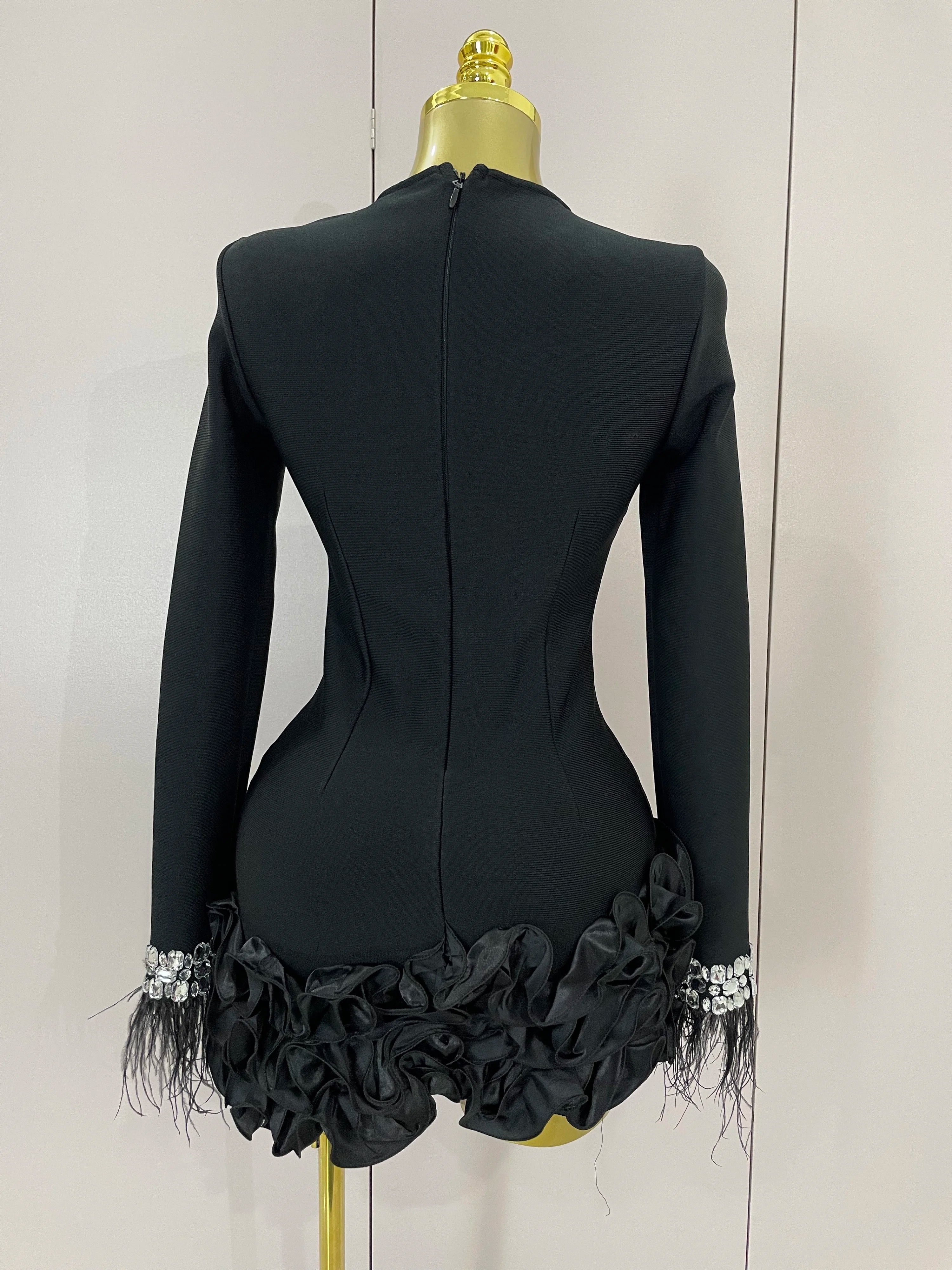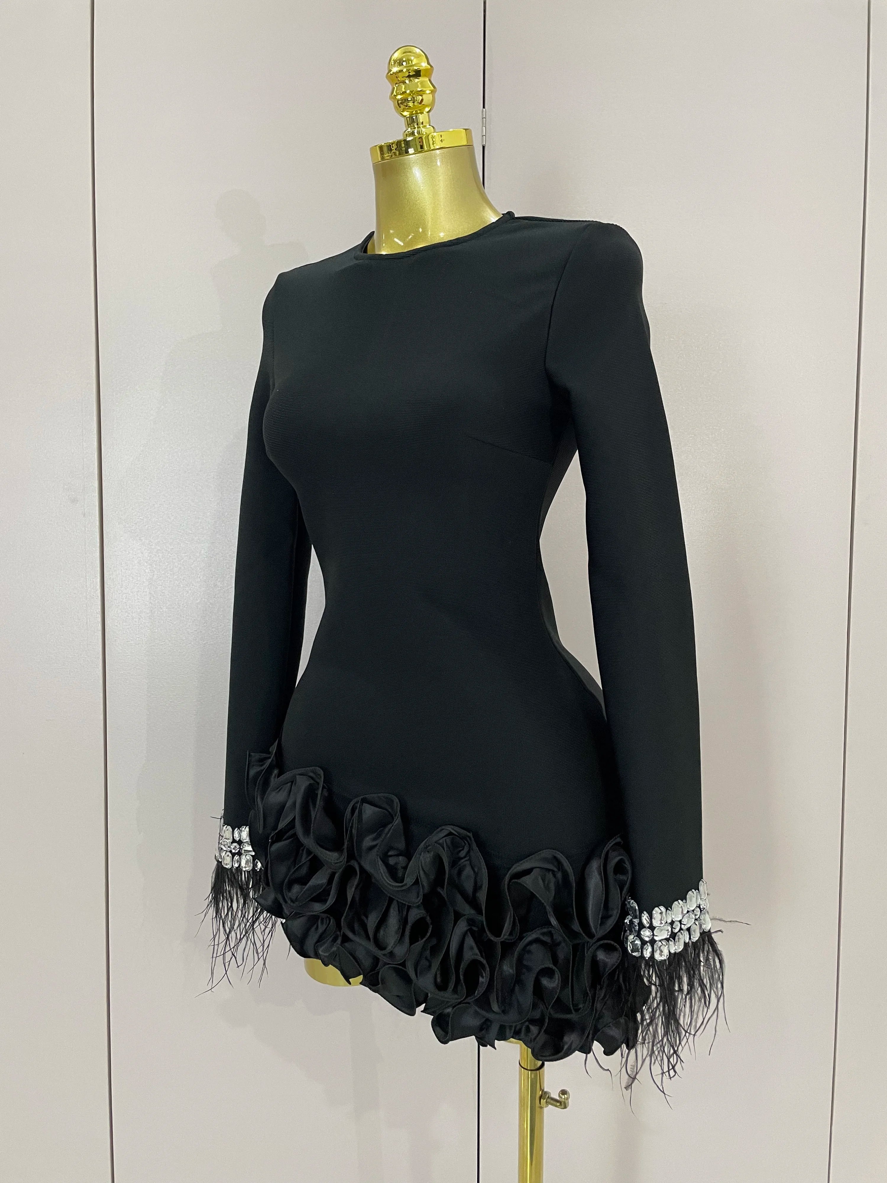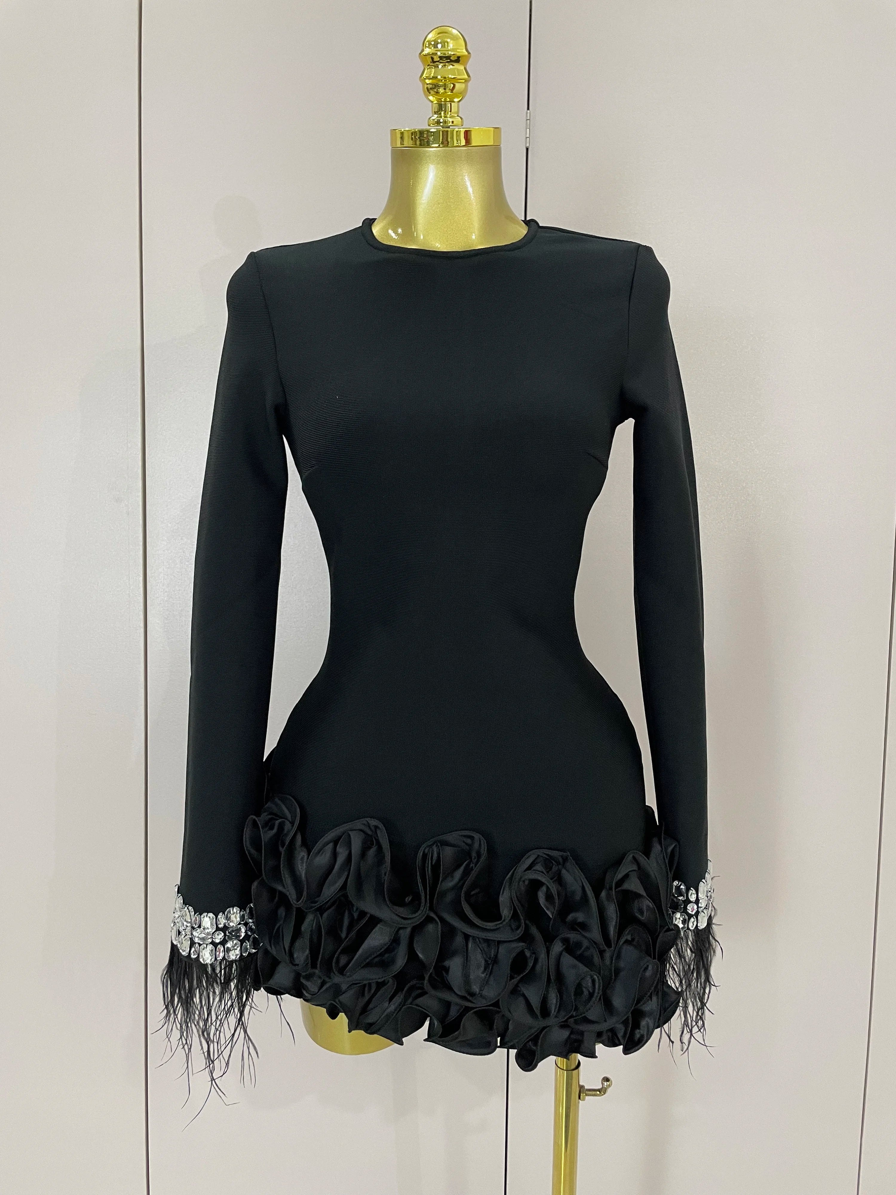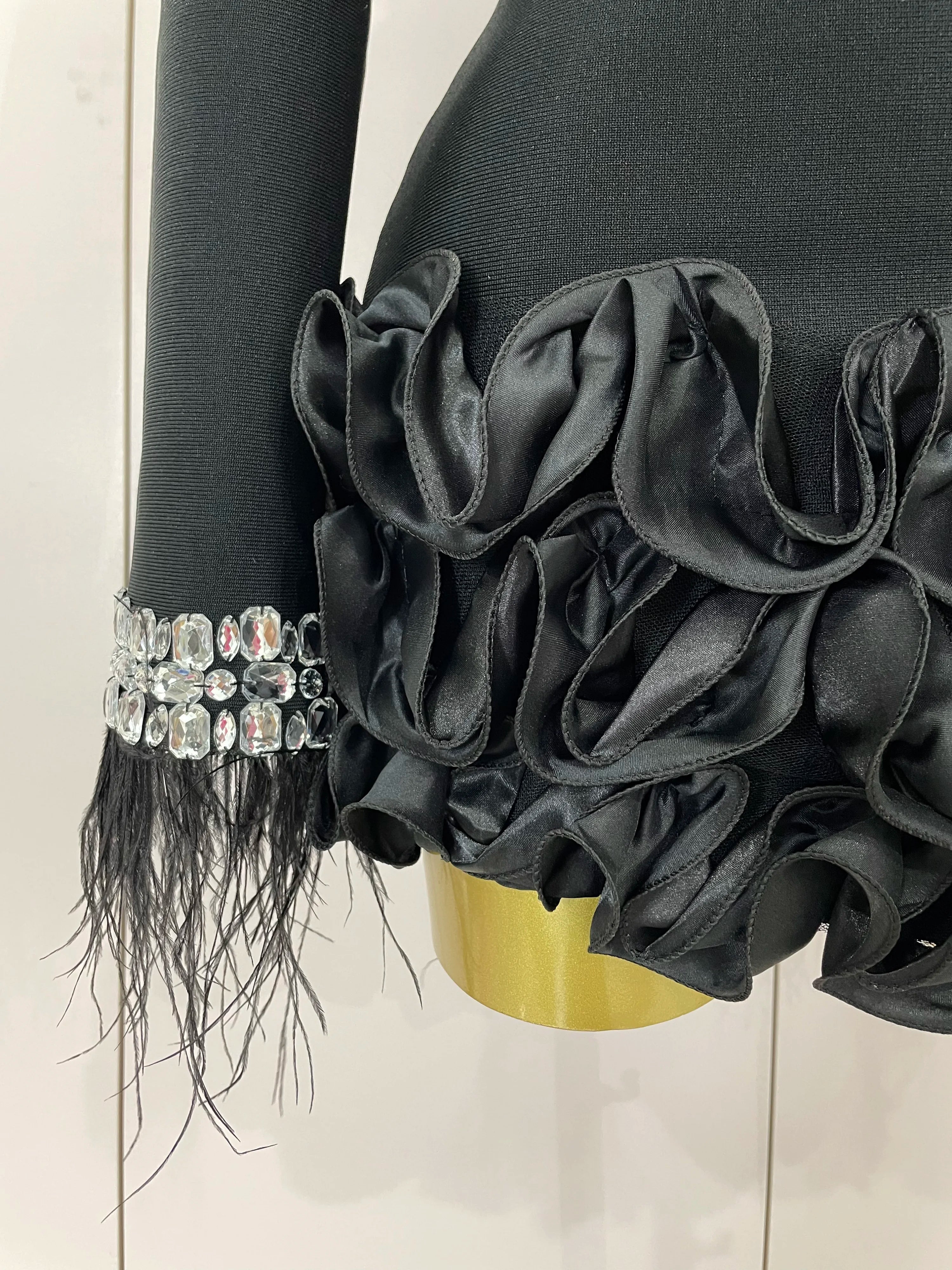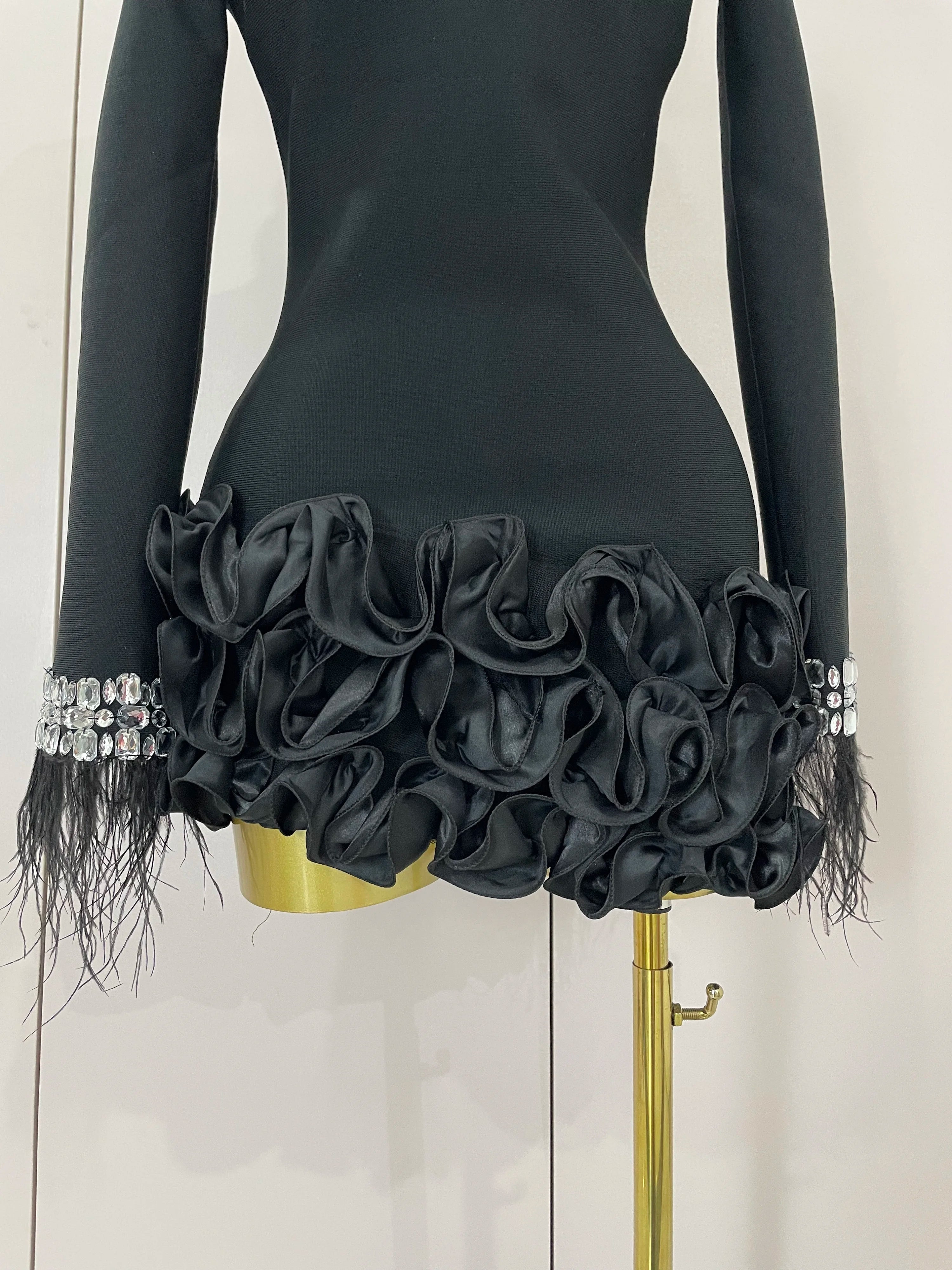 Nicole shiny diamond feather long-sleeve bodycon dress with sparkling crystals and elegant feather cuffs.