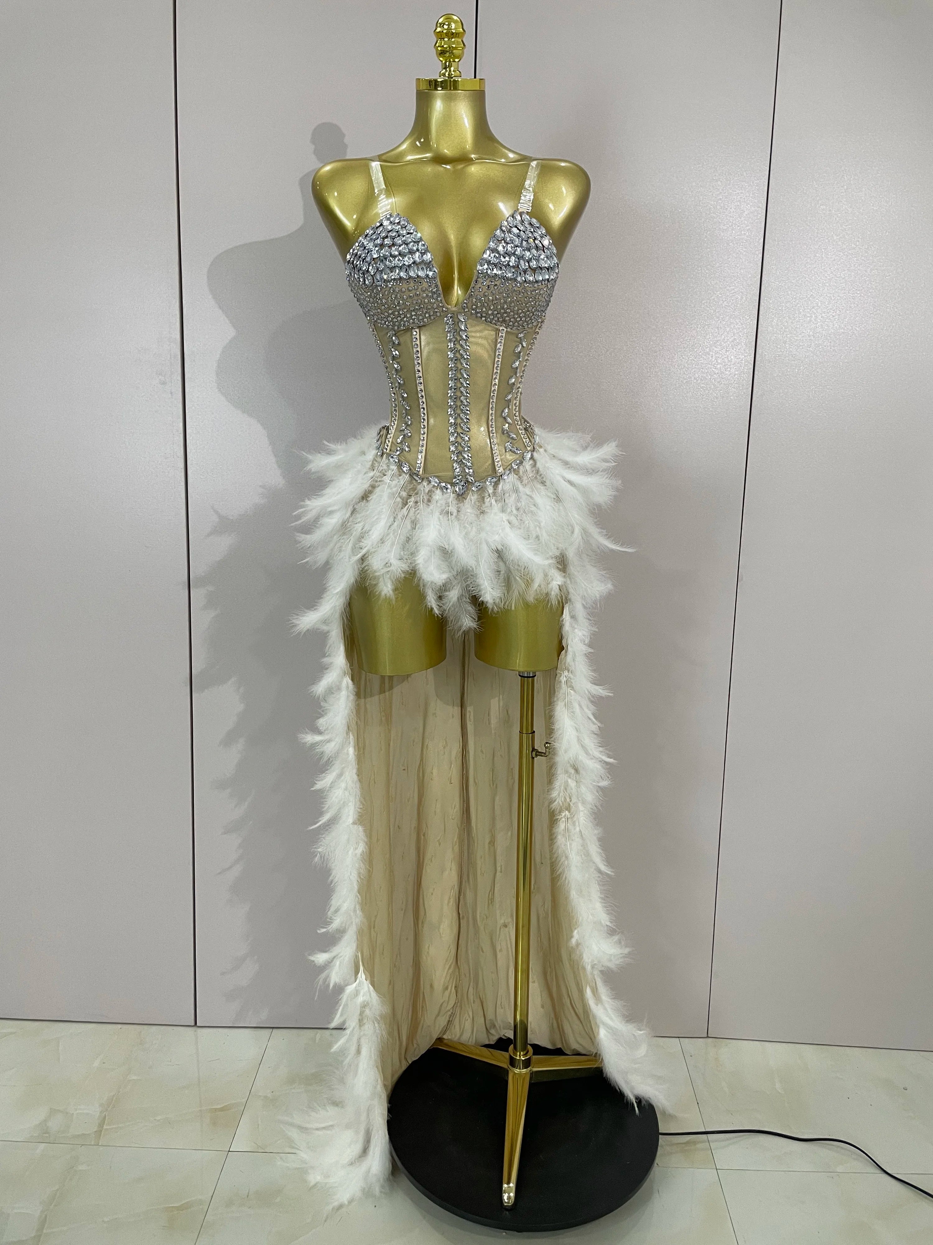 Gabrielle Luxury Rhinestone Feather Mesh Long Tail Bodysuit