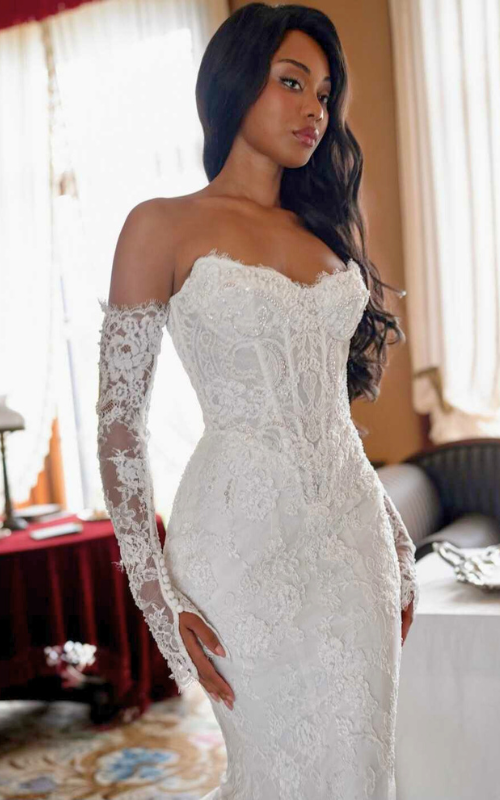 Exude timeless elegance in this Lace Sweetheart Mermaid Wedding Dress. Featuring a flattering sweetheart neckline, delicate lace appliqués, and a graceful sweep train, this gown hugs your curves and flows beautifully for a romantic bridal look. Perfect for weddings, bridal photoshoots, or formal ceremonies, it combines classic charm with luxurious detailing.