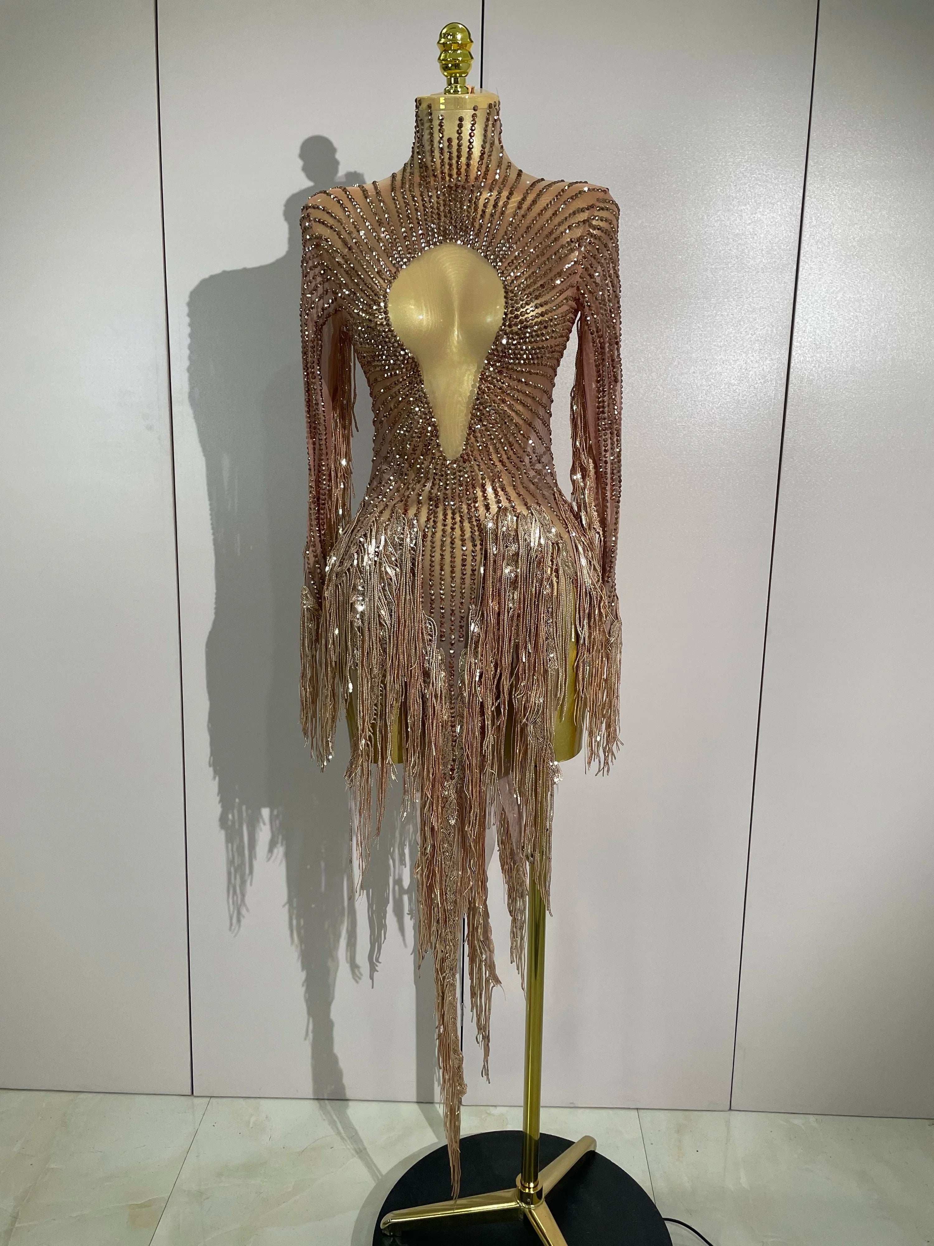 Aimee Sexy Sheer Mesh Long Sleeve Sparkly Rhinestone Sequin Tassel Dress