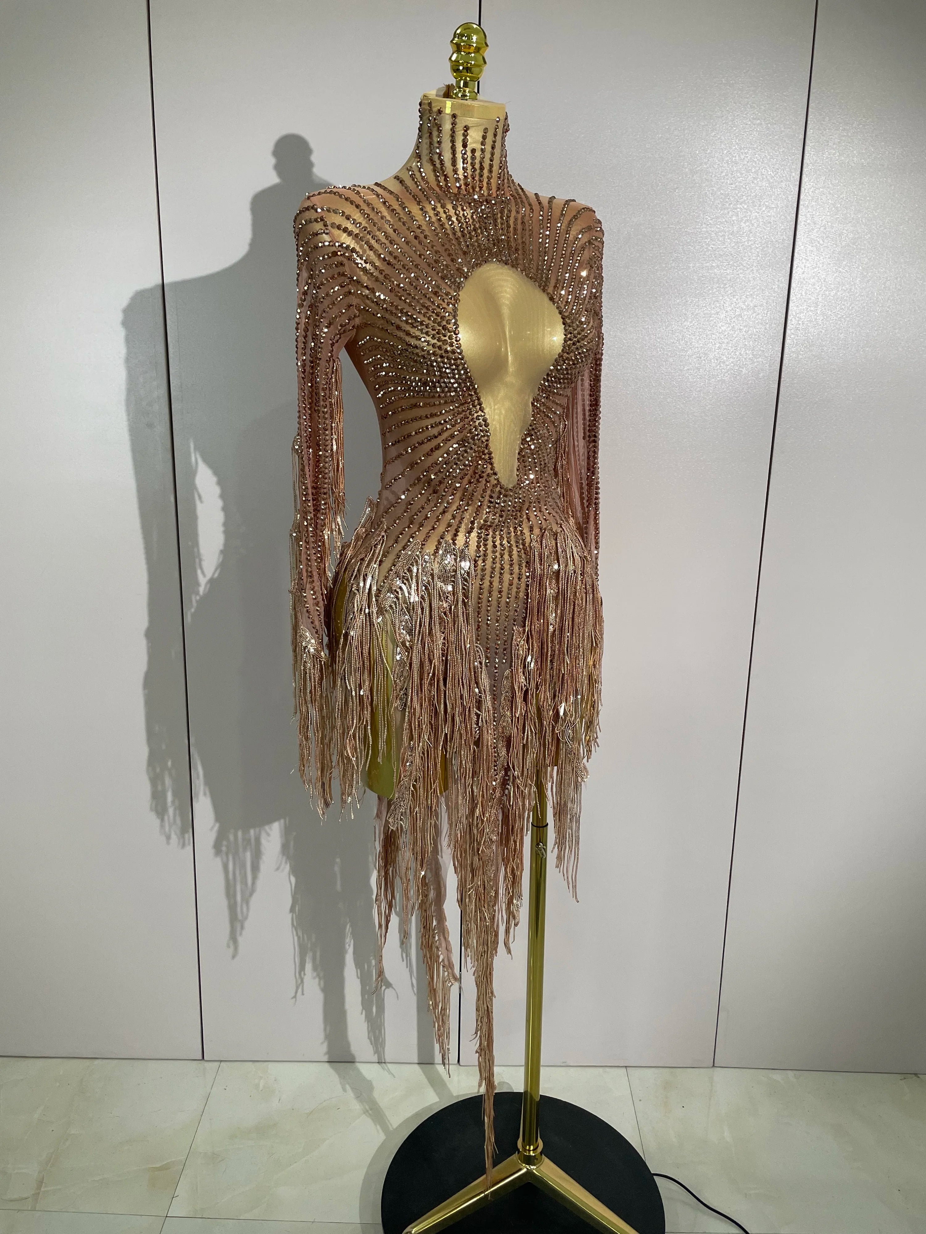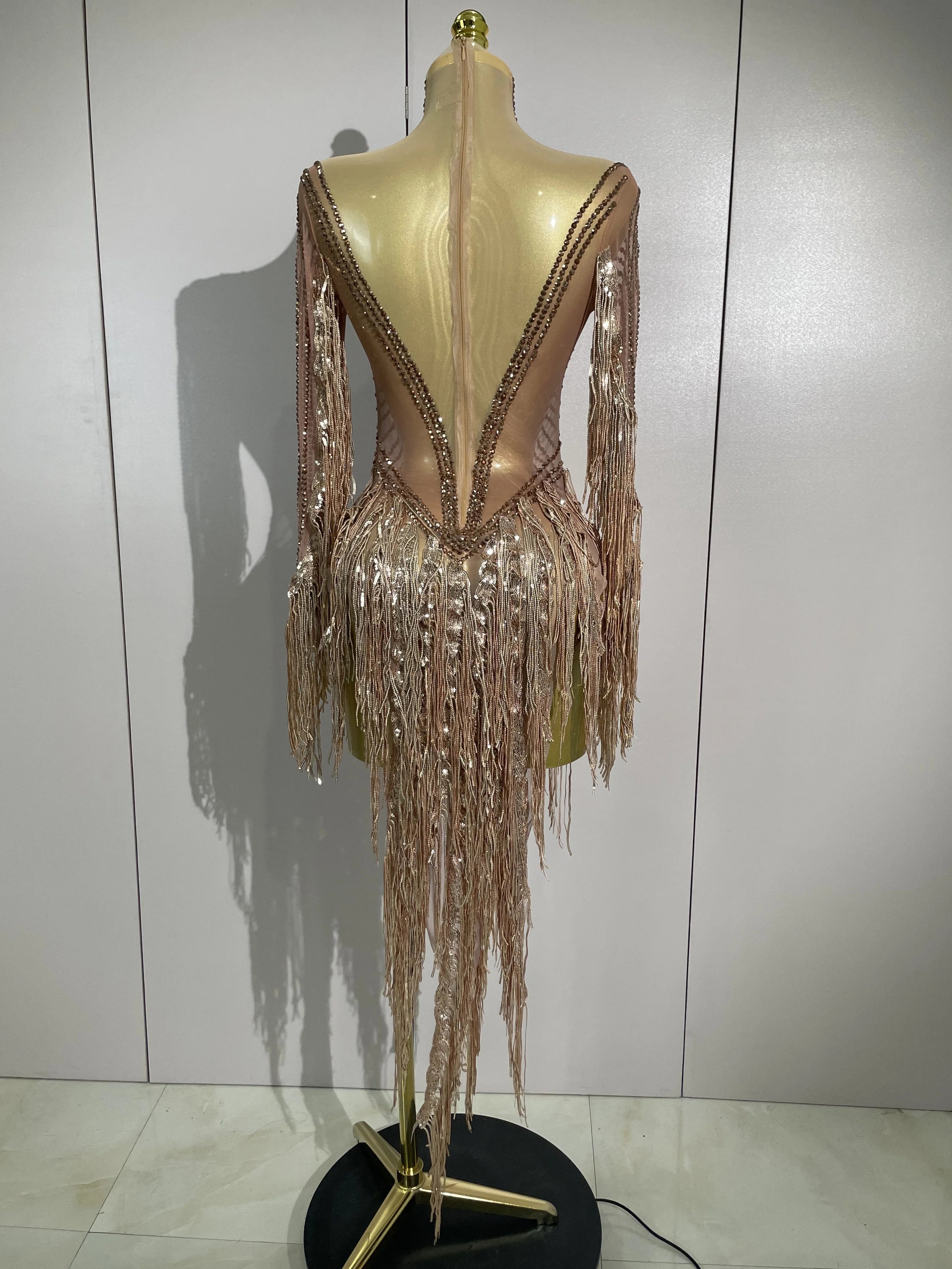 Aimee sexy sheer mesh long sleeve sparkly rhinestone sequin tassel dress
