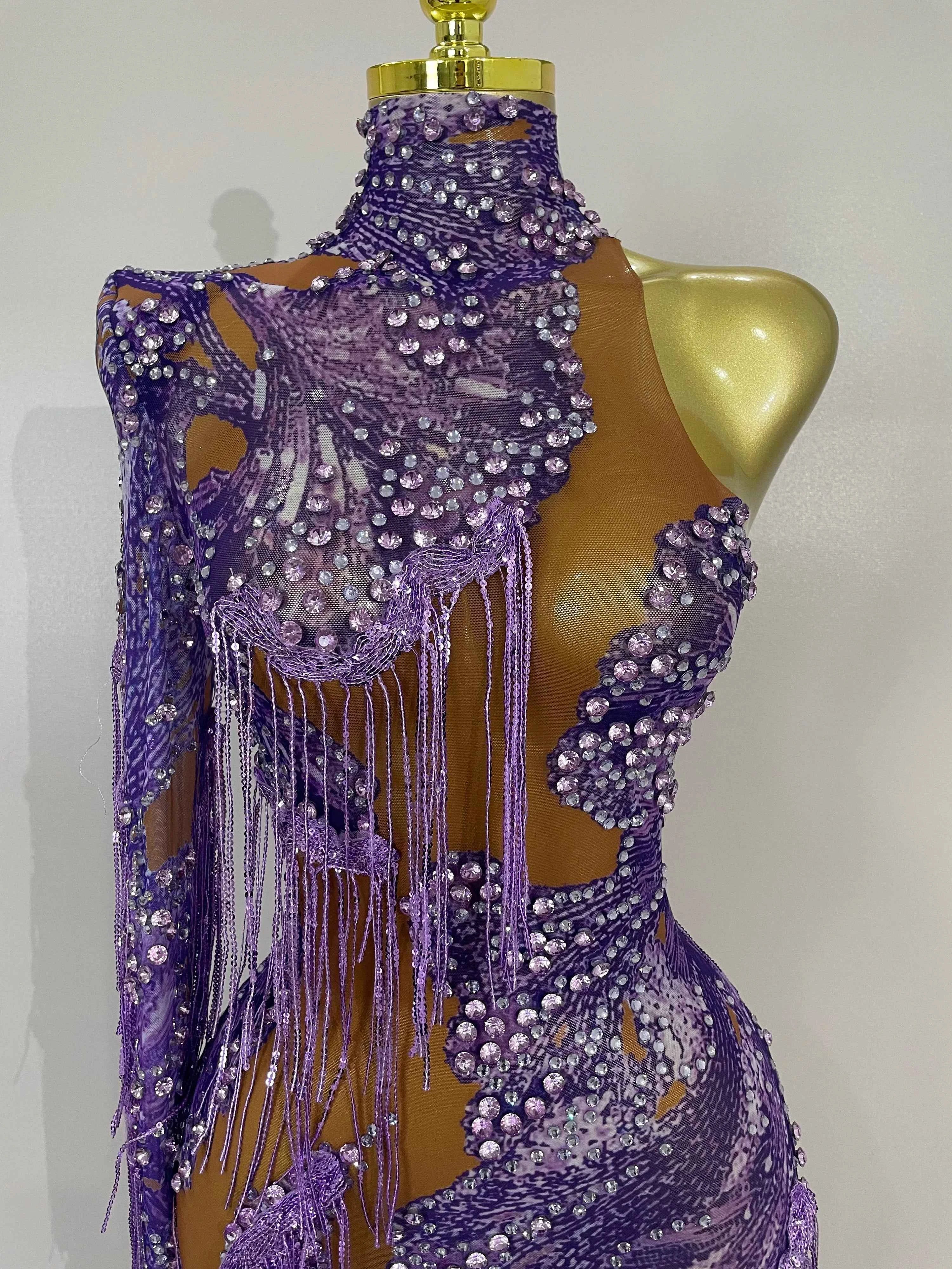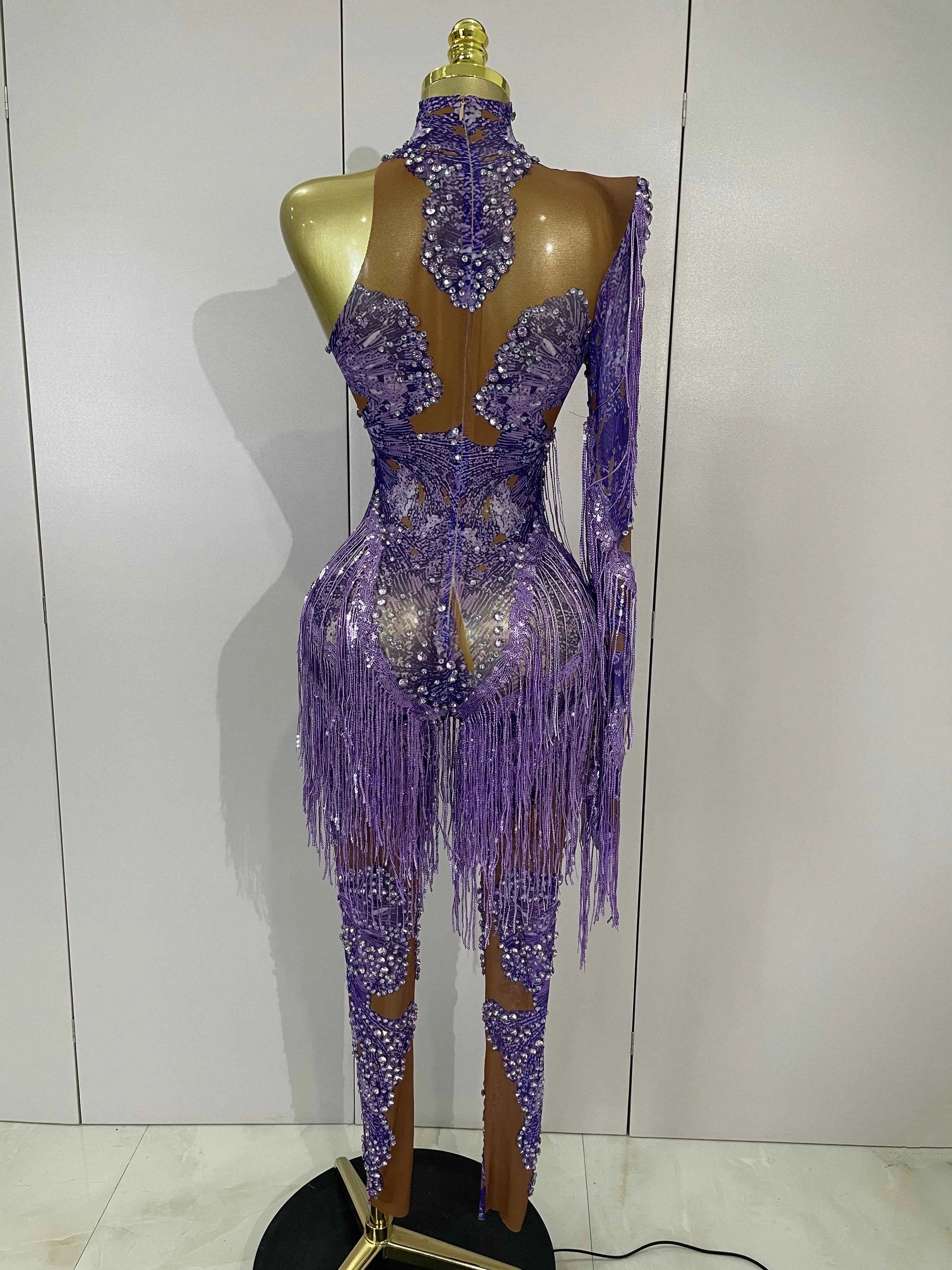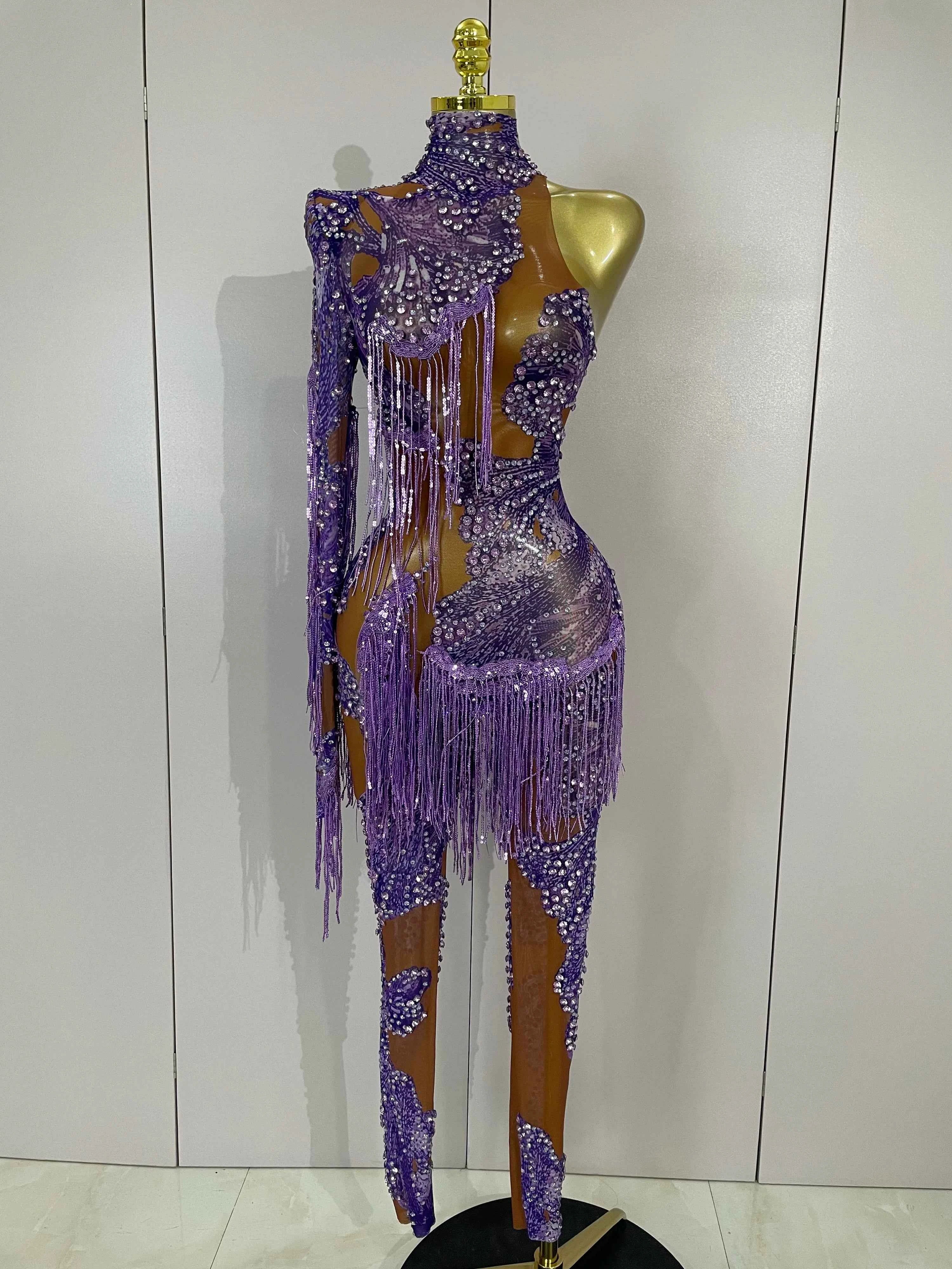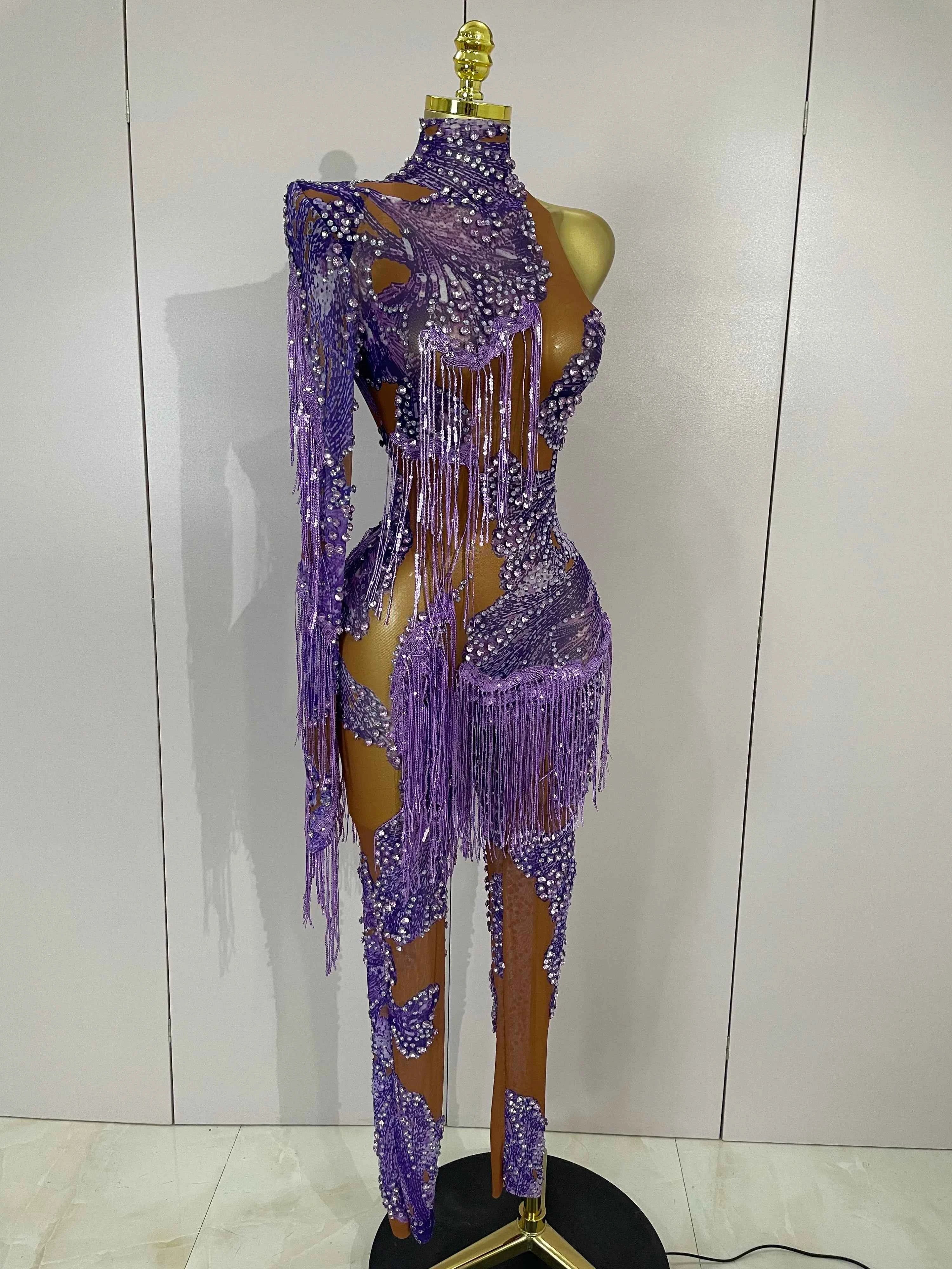 Dayla is made to move and shine. This Sparkle Diamond Purple Tassel One-Shoulder Mesh Jumpsuit features sheer mesh fabric adorned with shimmering diamond-style accents and tassel details that sway with every step. The one-shoulder design adds bold asymmetry while the fitted silhouette delivers confident, show-stopping energy. Perfect for birthdays, stage performances, parties, and nights that demand attention.