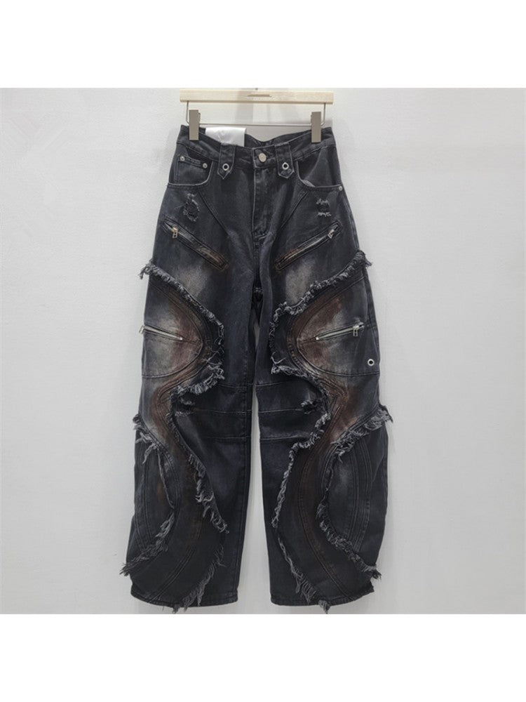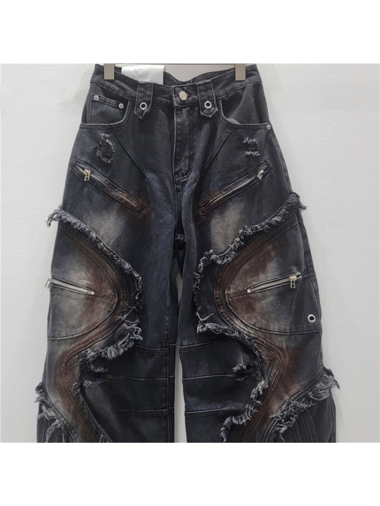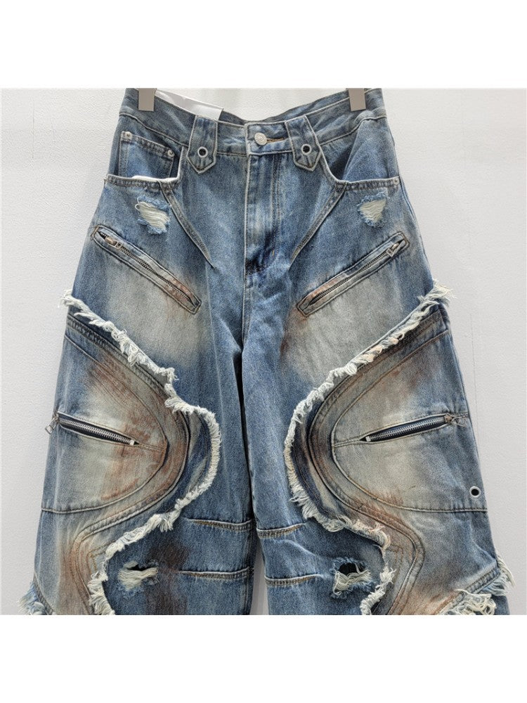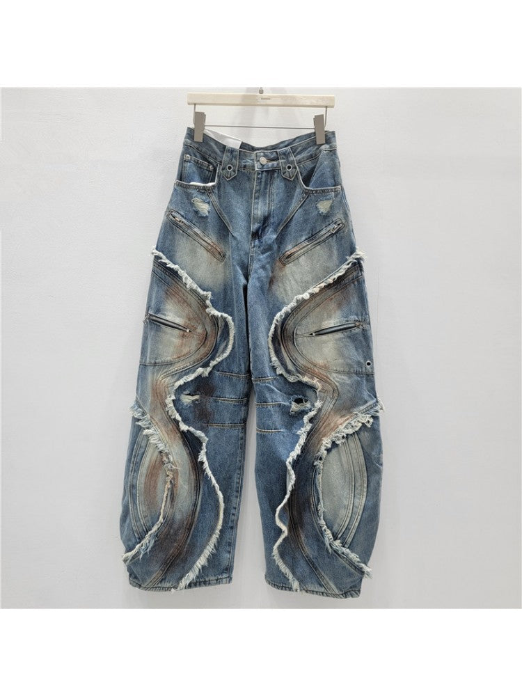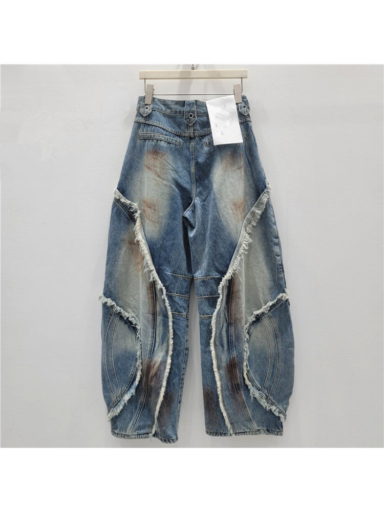 Distressed Fuzzy Trim Denim Barrel Jeans