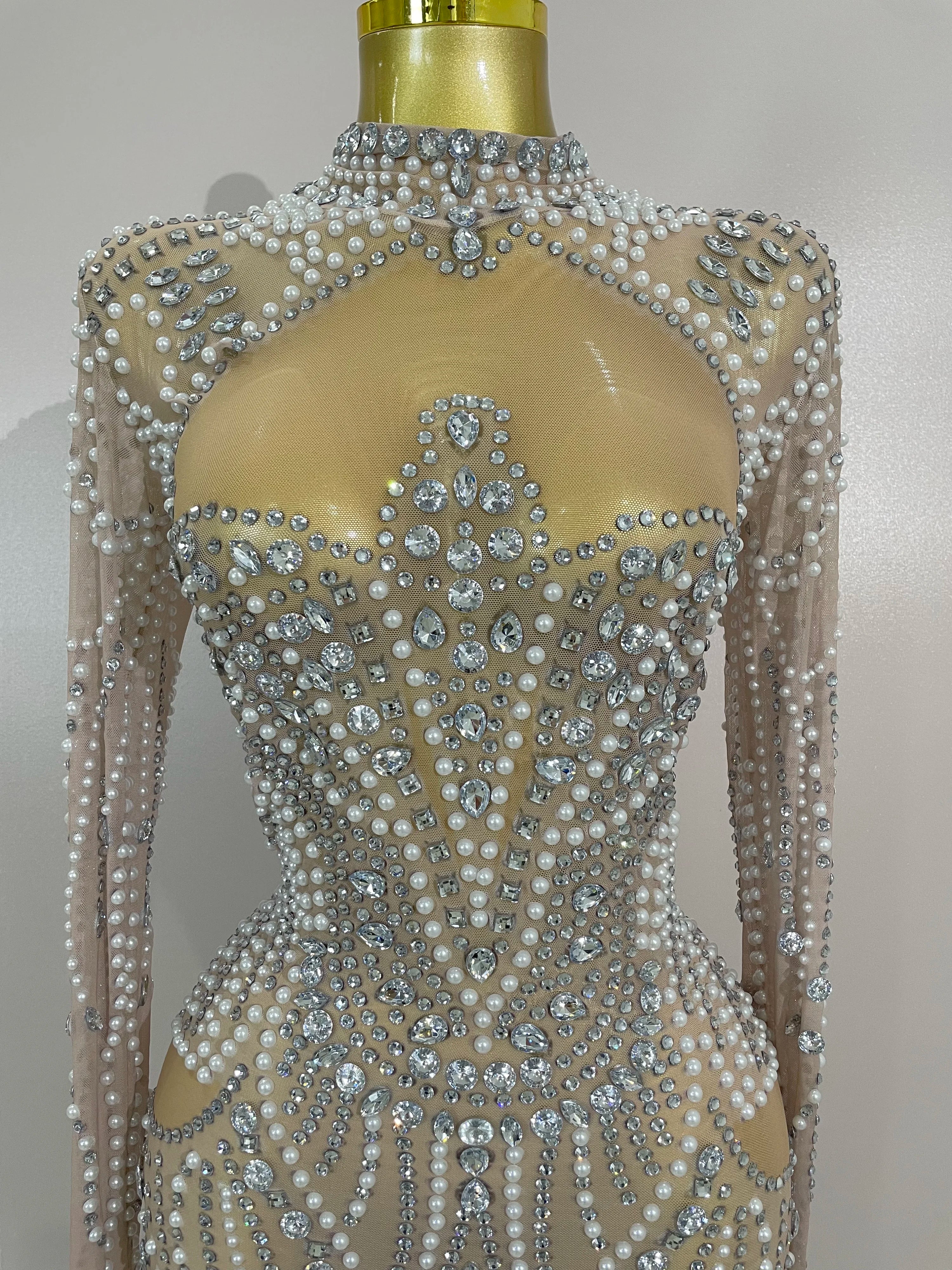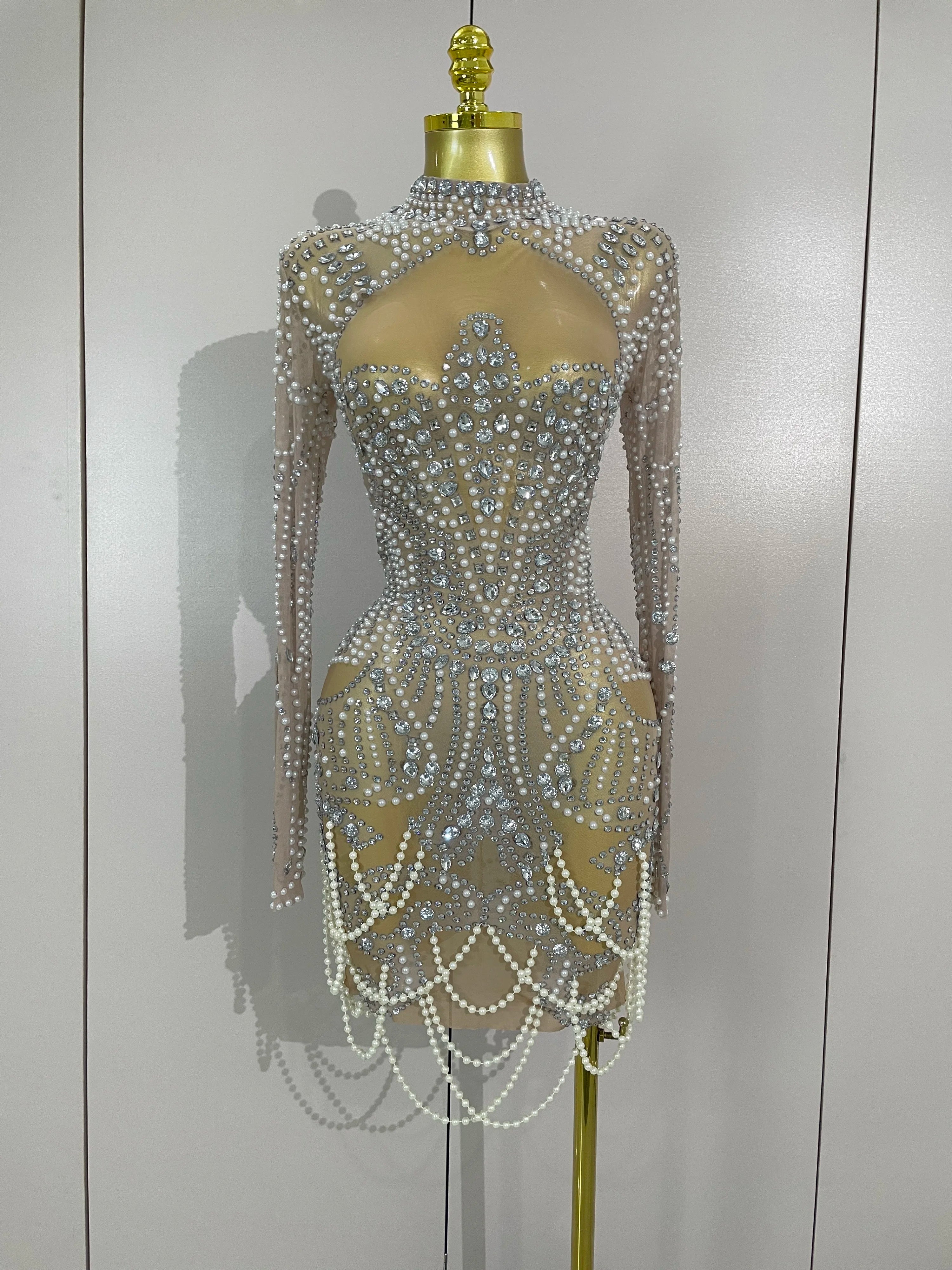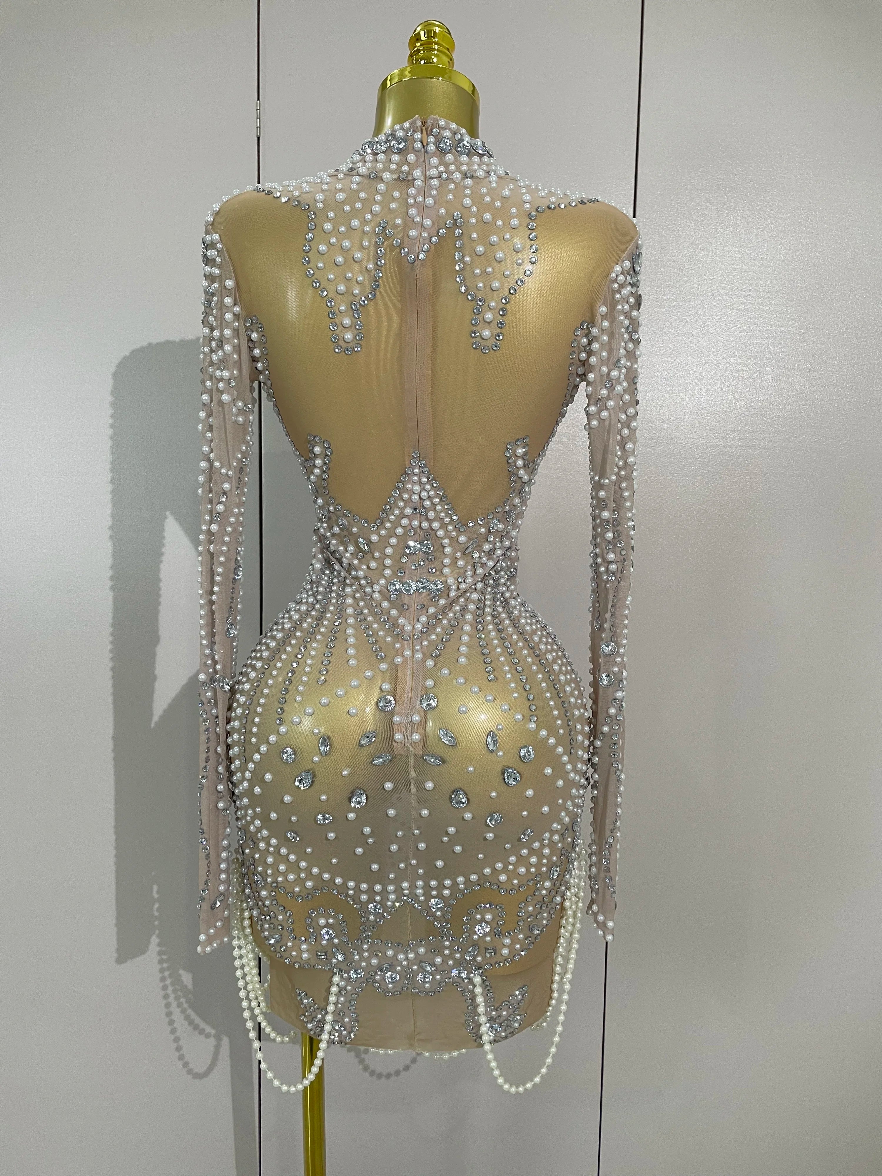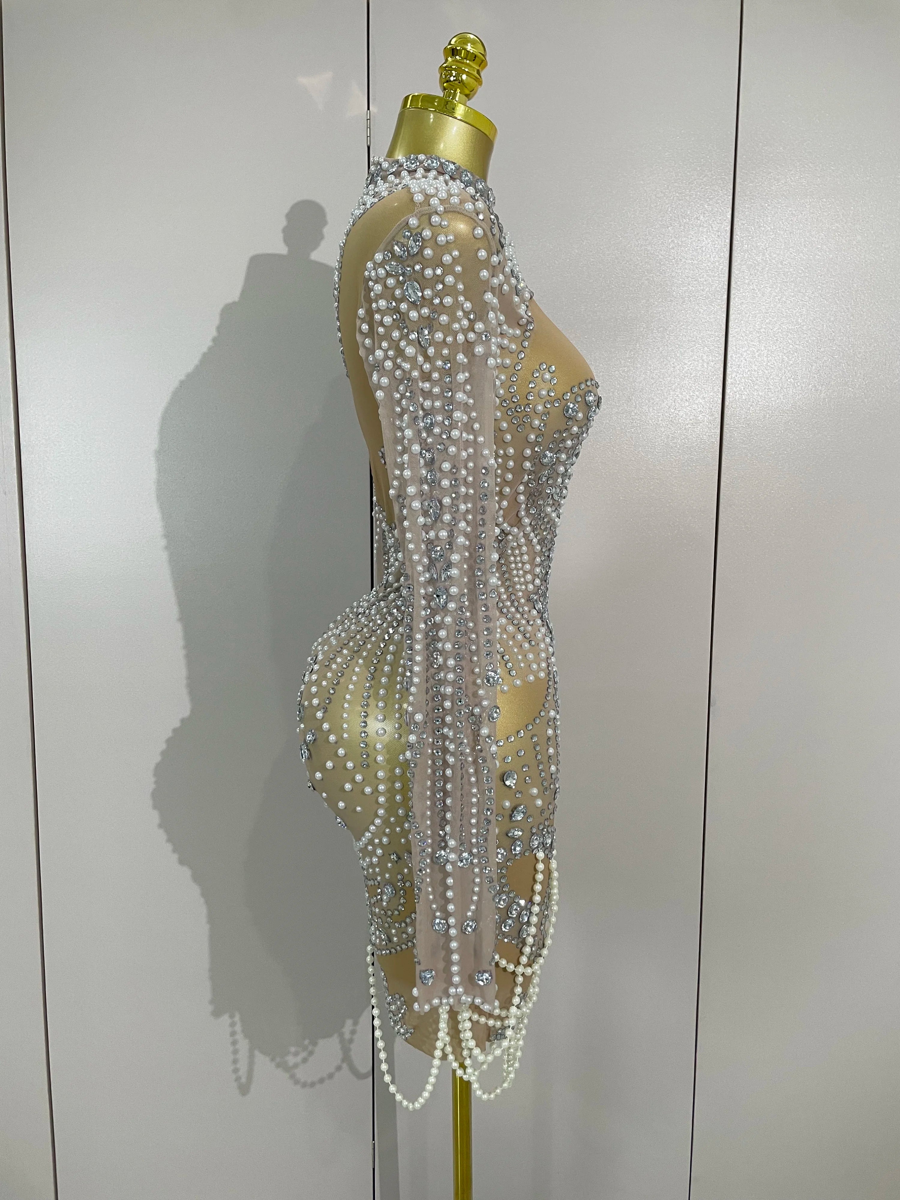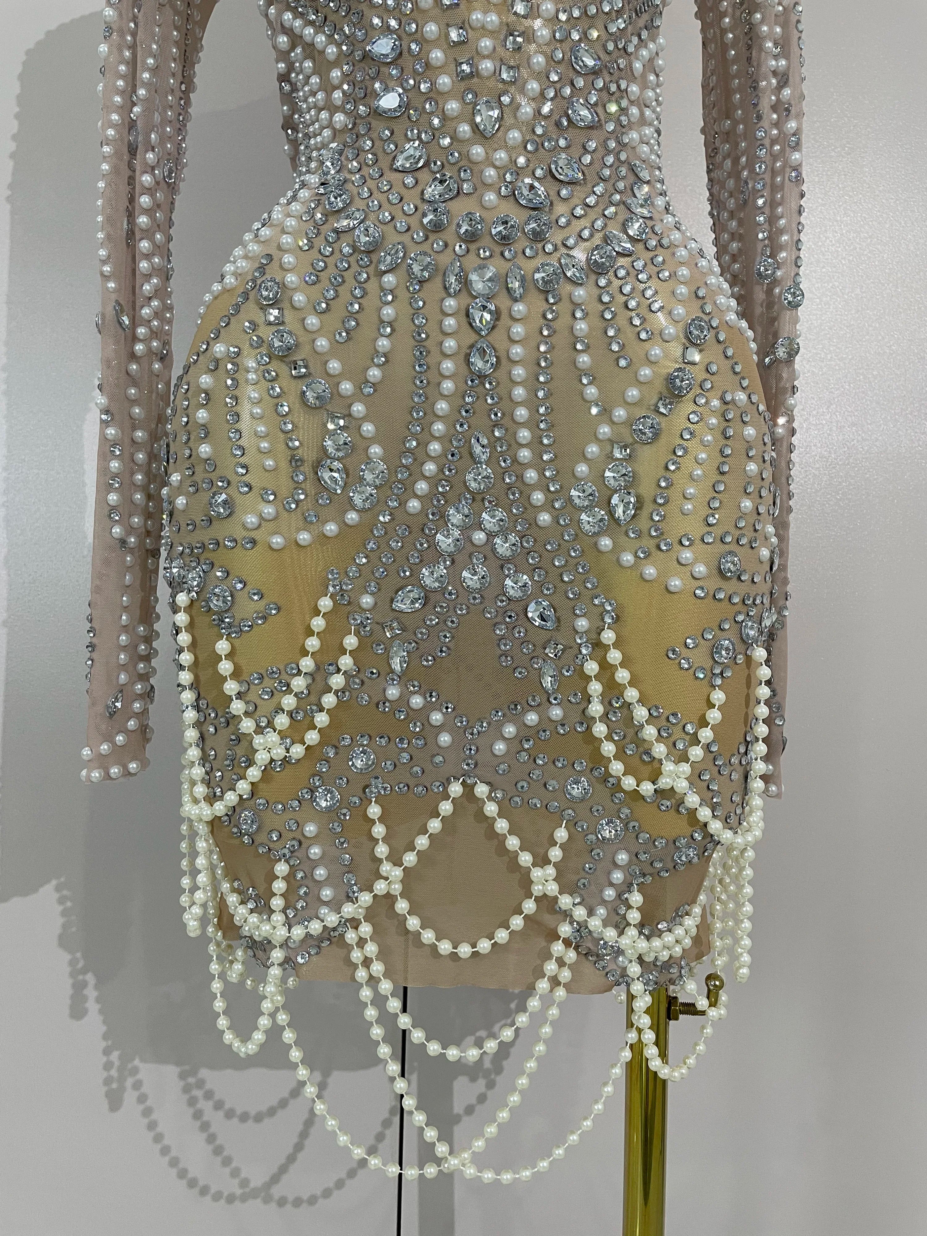 Brenda Short Mesh Dress With Pearls and Sparkling Diamonds