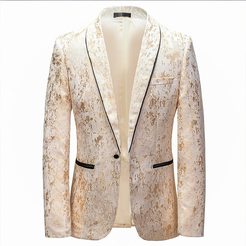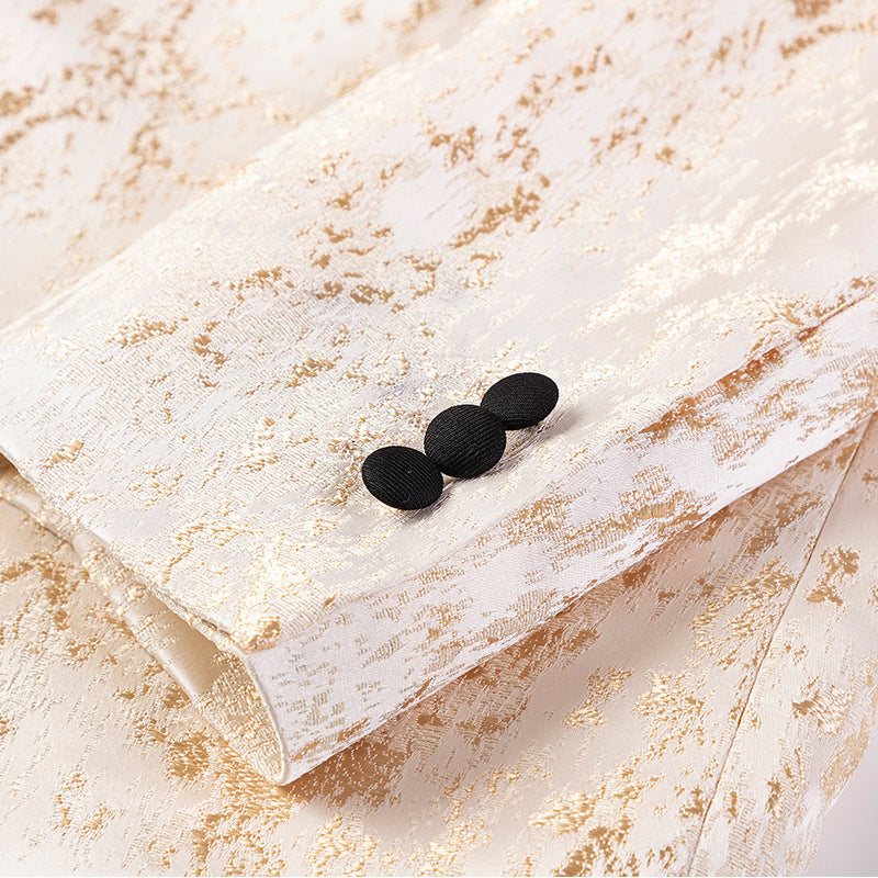 Men’s luxury cream and gold metallic slim fit dinner jacket with matching pants for formal or wedding wear