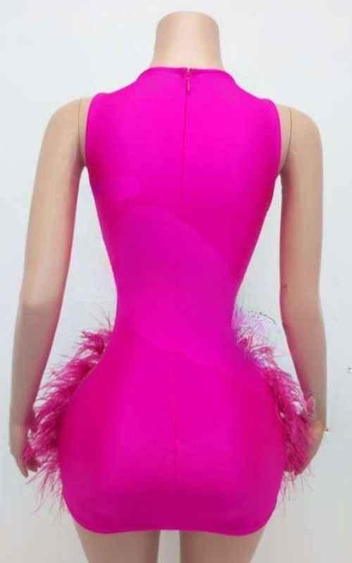 Step into full spotlight mode with this intricate rhinestone mesh party dress finished with plush ostrich feather trim. Designed for luxury parties, birthdays, nightlife, and statement events, this dress blends sheer mesh illusion with high shine rhinestone detailing for a bold, editorial look.